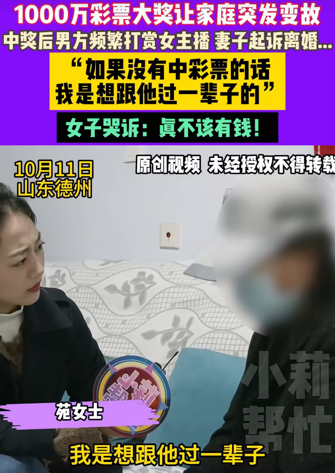 “他中奖前说会陪我到老,现在却把卡里的钱全转走了!”山东德州的苑女士攥着空银行卡,在镜头前哭得浑身发抖。去年12月,她丈夫中了1017万大奖,税后实得814万,可这笔钱非但没让日子变甜,反而成了撕裂婚姻的利刃——丈夫取走710万后,整夜给女主播打赏,4天不归家,被发现时正和女主播同进同出。更扎心的是,他曾当着苑女士的面说“要找个主播生孩子”。