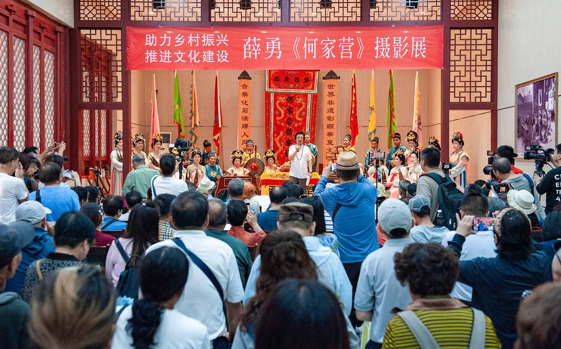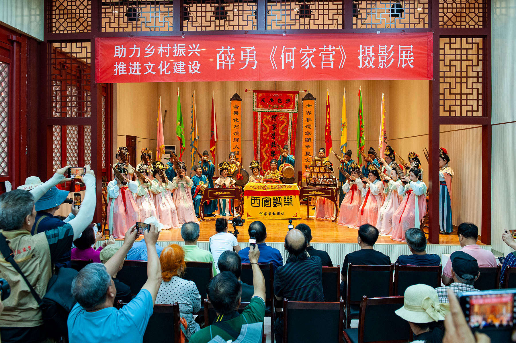 此次展览是薛勇受西安市人民政府办公厅委派,担任何家营乡村振兴顾问期间的创作成果。在两年驻村实践中,他以摄影家的敏锐视角和乡村建设参与者的双重身份,深入何家营村巷阡陌,用相机、手机、无人机镜头记录下这片土地在“农耕社会向商业文明转型”关键期的真实面貌。展览以“村容村貌——新旧交织中的乡村底色;大事小情——基层治理的微观切片;街头巷尾——烟火气里的生活诗篇;老老少少——代际传承中的乡村活力;千年鼓乐——文化根脉的当代回响”五大板块为脉络,共展出80余幅作品,全景式呈现何家营在乡村振兴战略推动下的蜕变历程。