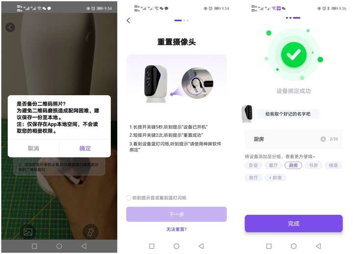绑定设备更简单:长按 3 秒开机,听 “神眸已开机” 提示音后, “神眸” APP扫一下摄像头主机上的二维码进行绑定,前后2分钟就能搞定,对数码小白也十分友好。