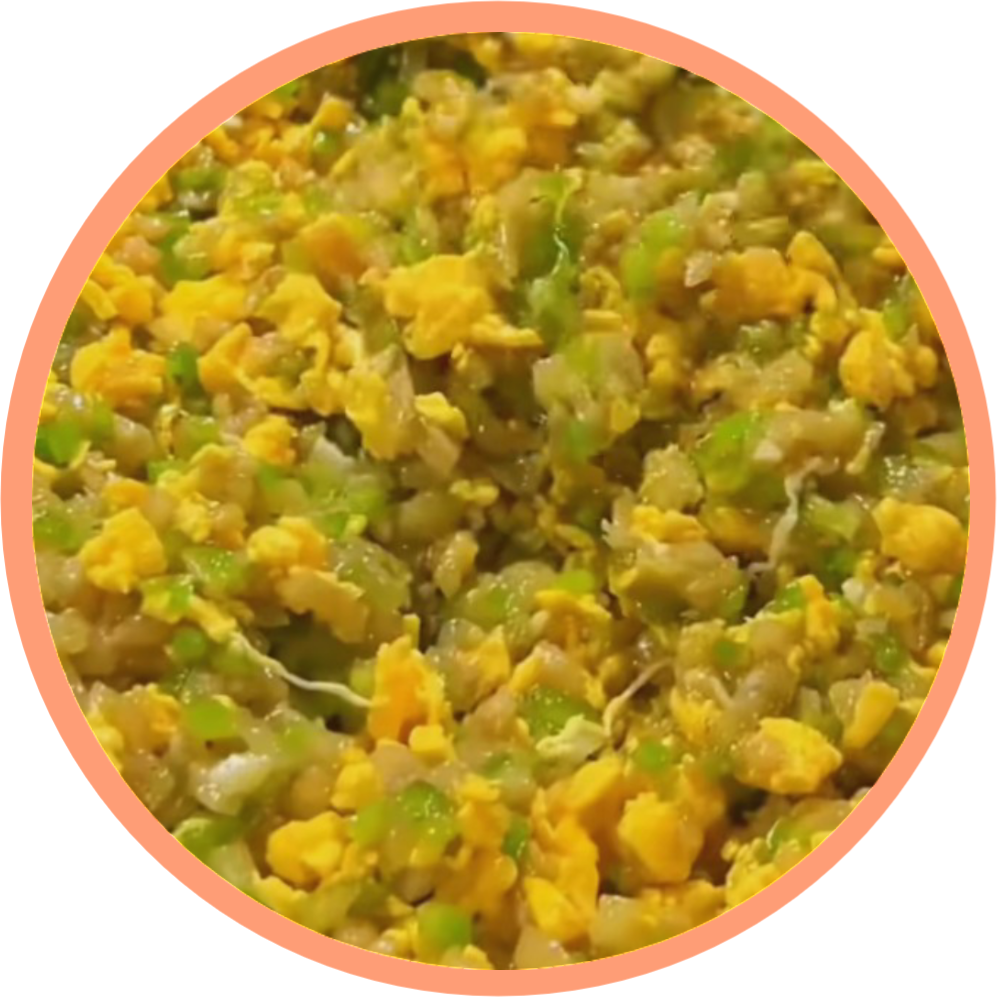 青椒切丁,煸炒一下去生味,不用炒太熟,保持微微脆感就可以,茄子切成小丁,加点盐腌10分钟,挤干水分后小火煸炒2分钟,这样能去掉涩味,鸡蛋打散炒碎,把这三种食材放在一个大碗里,加入盐、香油、少许白胡椒粉,拌匀即可。