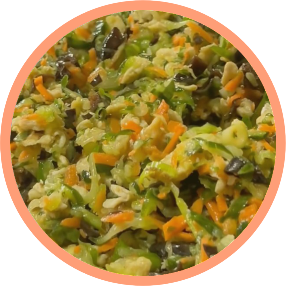 鸡蛋打散炒碎,晾凉备用,西葫芦擦丝,加少许盐杀水后挤干切碎,把鸡蛋和西葫芦混合,加入香油、生抽、少许胡椒粉、半勺盐,拌匀即可。