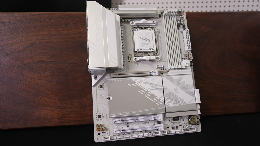 B850 AORUS ELITE WIFI7 ICE冰雕主板是标准的ATX板型,主板采用了白色PCB,板基用料为6层2盎司铜,十足扎实。插槽部分也是白色风格,视觉效果非常统一,对于喜欢二次元的玩家而言,非常有吸引力。