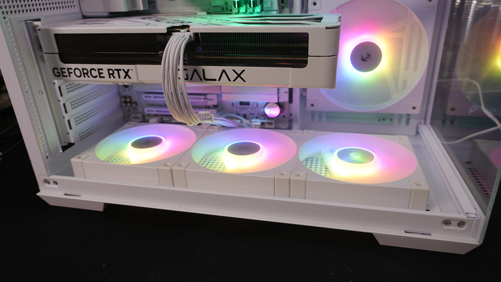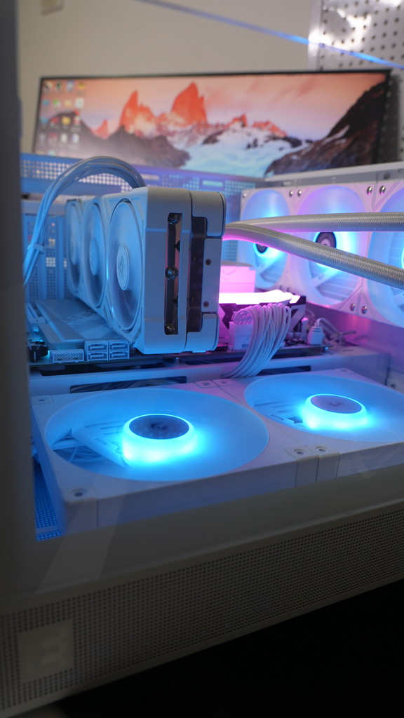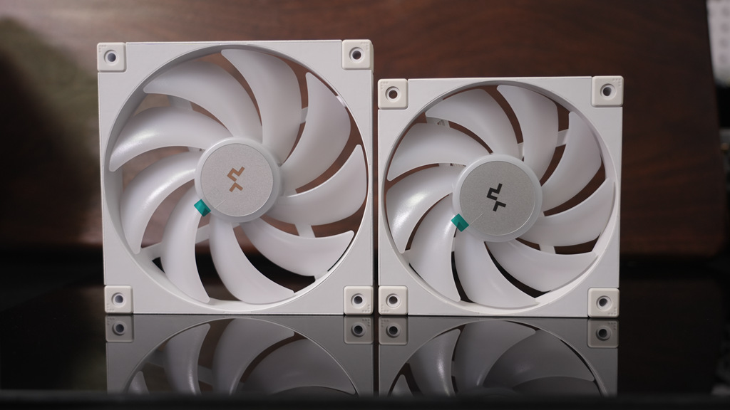 机箱散热风扇选择了九州风神的FD12白色和FD14白色。为了应对机箱不同安装位置的尺寸规格,12厘米和14厘米的风扇同时备用。这两款风扇的外观、灯效、性能都是相似的,只有尺寸不同。
