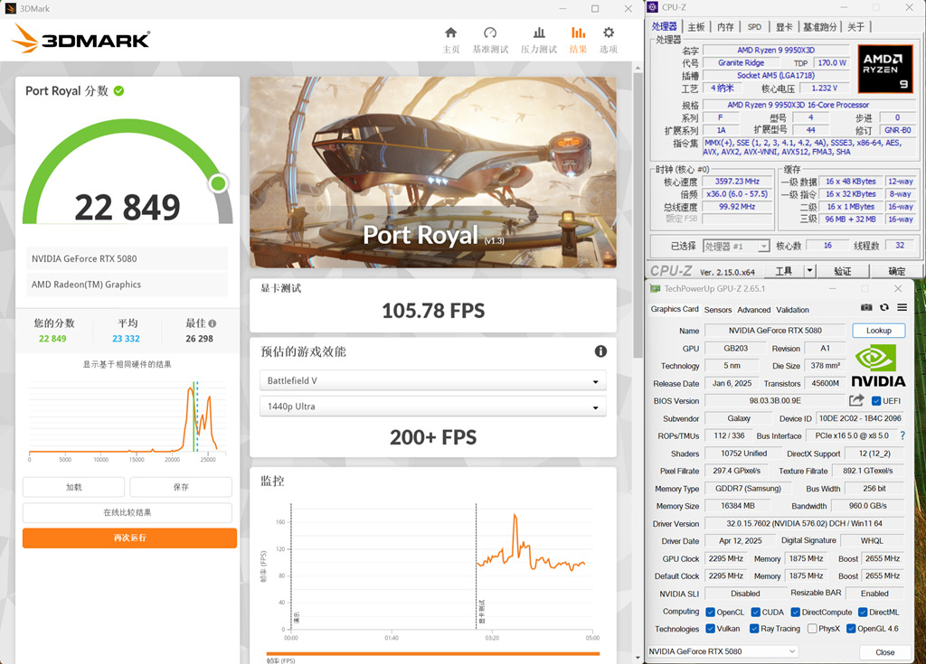 RTX5080核心为GB203架构,5nm工艺。拥有流处理器10752个,112个光栅单元,336个纹理单元,默认频率2295MHz,BOOST频率2655MHz。显卡位宽256Bit,显存为GDDR7,显存容量16GB,显存等效频率30000MHz。