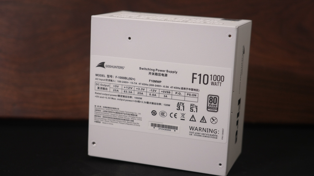 选用了长城品牌猎金F-1000BL全模组电源,型号为F10,额定功率为1000W,通过CCC认证,电源最高转换效率为92.41%,满足80PLUS白金标准,ATX3.1标准,支持PCIE5.1输出,支持10年质保。