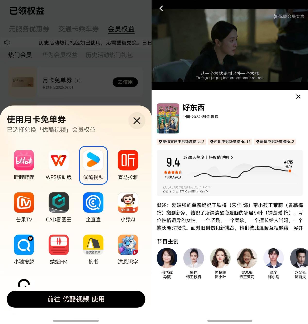 而且我算了下,光靠月卡免单券兑换的优酷会员已经让我能用到2026年了,这次要是抽中这个影视年卡,我的优酷会员直接就续到了2027年!宋佳说要刷新自己的系统,华为这是直接帮我的娱乐福利刷新到了两年后啊!