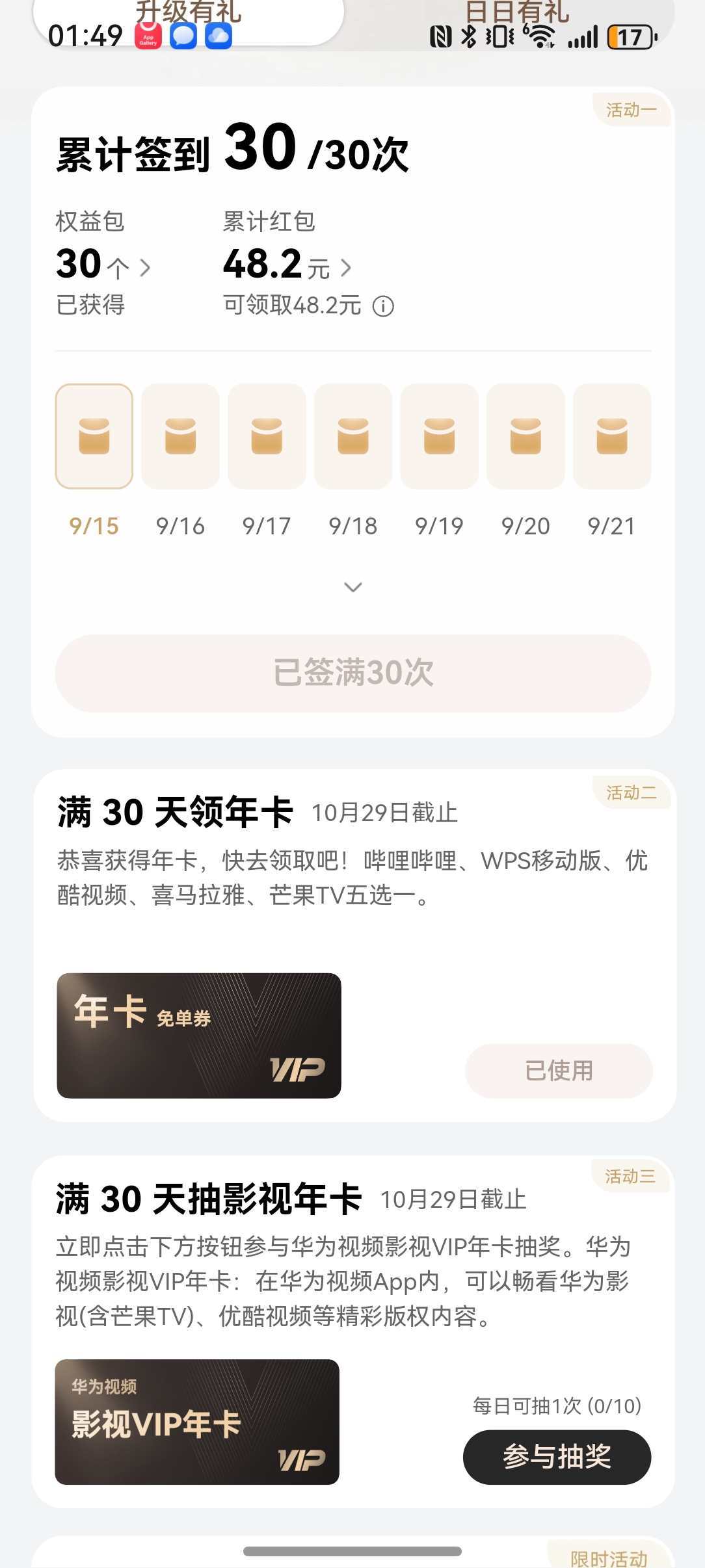 原以为每天签签到领点红包和会员,30天后就到头了,结果发现鸿蒙有礼活动竟然也是持续刷新的!最近“鸿蒙有礼”里又解锁了新玩法——首次签到后第30天,可以参与抽奖活动,奖品竟是影视VIP年卡,中奖后就能看遍未来一年的华为影视、芒果TV、优酷各种热播影剧综!每天可参与1次,最多可以抽10次,今天没抽中也不慌,明天接着点,多抽一次就多一份实现追剧自由的希望。