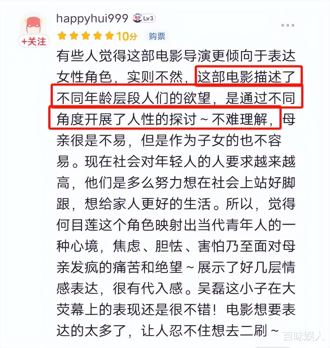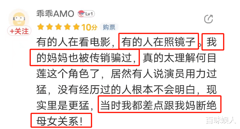 有网友就表示自己很理解电影里目莲为了拉母亲出传销时的那种无力感和歇斯底里,因为自己的母亲也曾进过传销组织,自己当时比目莲还要激动,甚至一度想断绝母女关系。