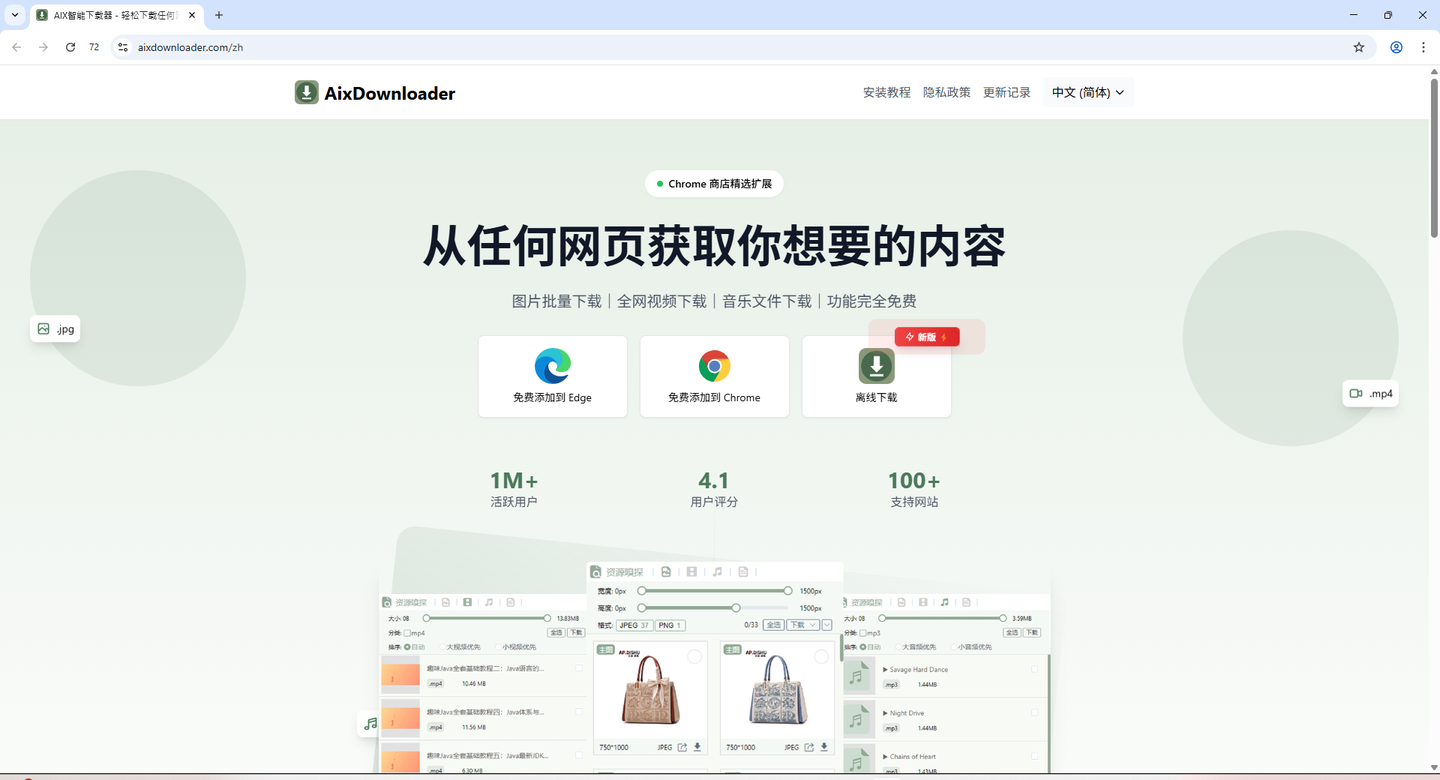6、AixDownloader这是一个可以从任何网页一键下载各种资源的网站。不管你是想要图片、视频、音频还是各种文档,只需要把这个插件简单安装到浏览器,它就能自动帮你嗅探和下载网页里的所有资源,不管你打开的是哪个平台,也不用管网站需不需要单独收费。这个插件可以全部无视,点击这里下载按钮,就可以直接免费下载。