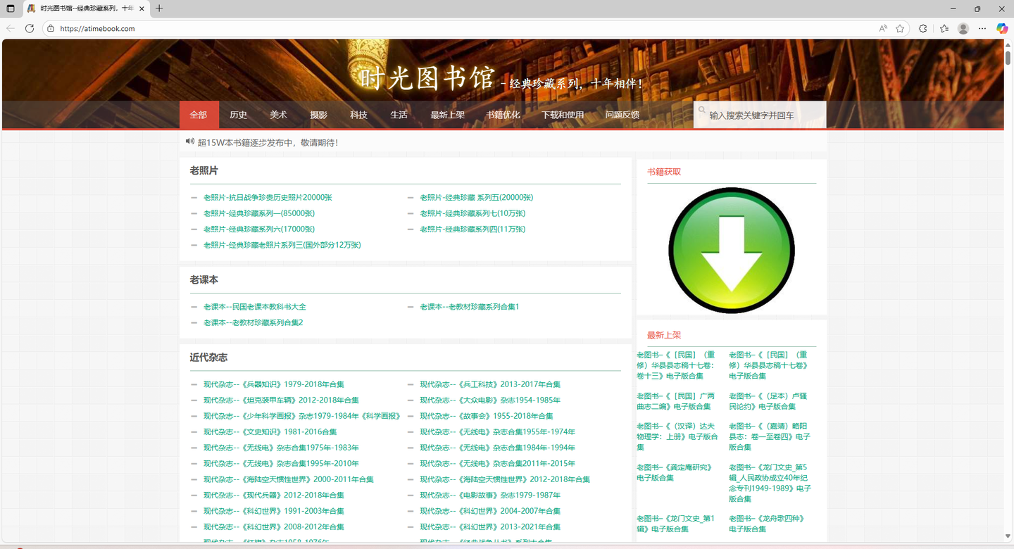 7、A TimeBook时光图书馆这是一个专门免费收藏并分享各类老旧书刊珍稀文献和历史资料的在线数字图书馆。你平时找不到的老报纸、怀旧杂志、经典连环画和珍贵历史照片在这里全都能免费看。它不仅支持在线阅读,还能一键网盘下载,永久保存到本地,随时离线查阅,比如老报纸、人民日报申报、怀旧杂志、科幻世界故事会,还有海量地方志网站还提供了专用的多终端阅读器,无论是电脑还是手机下载后阅读体验直接拉满