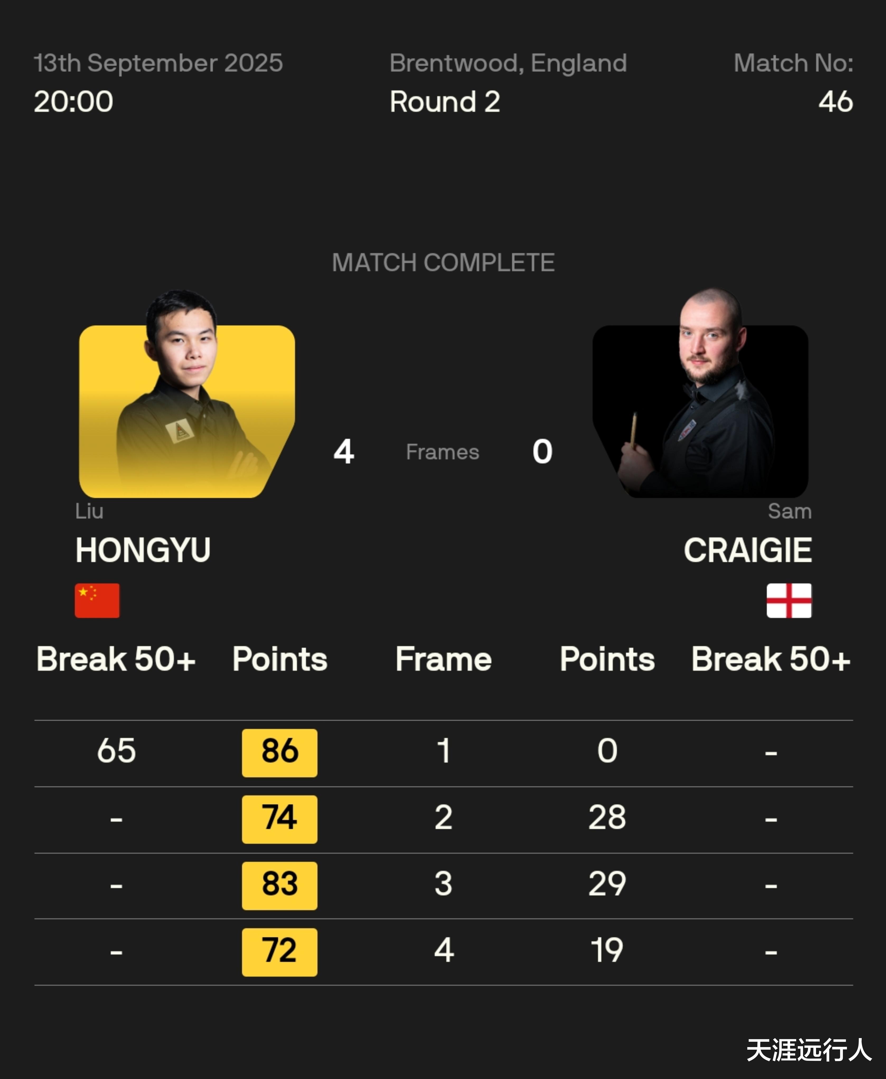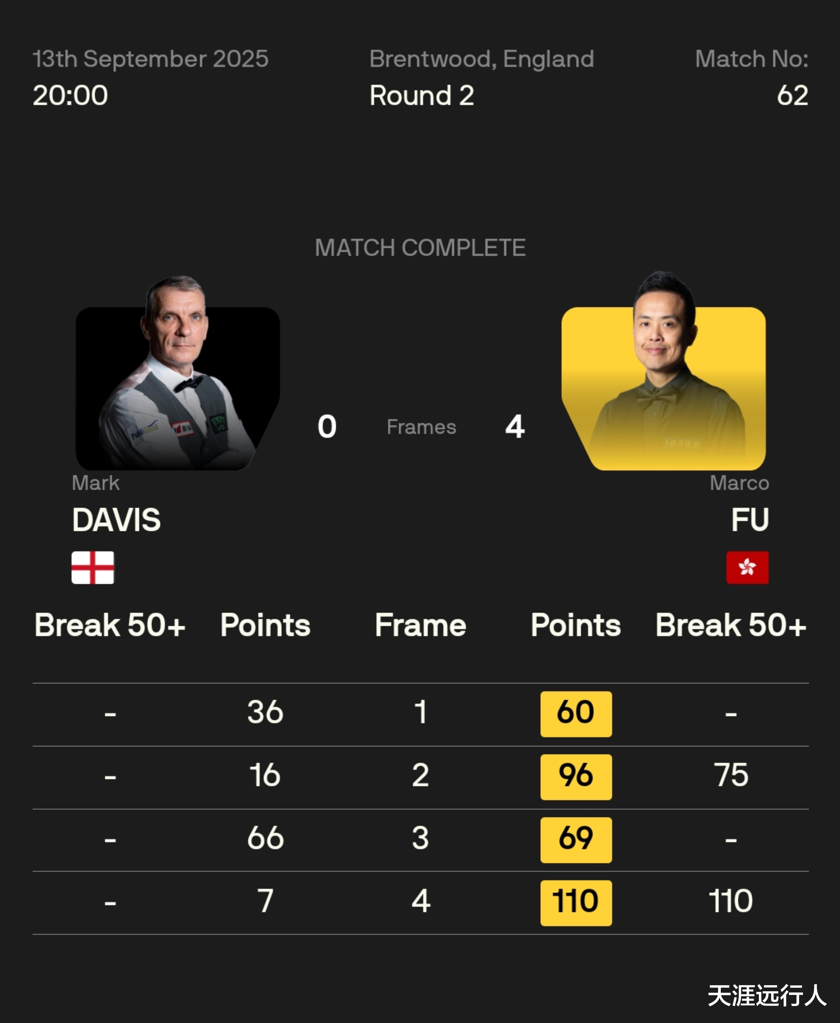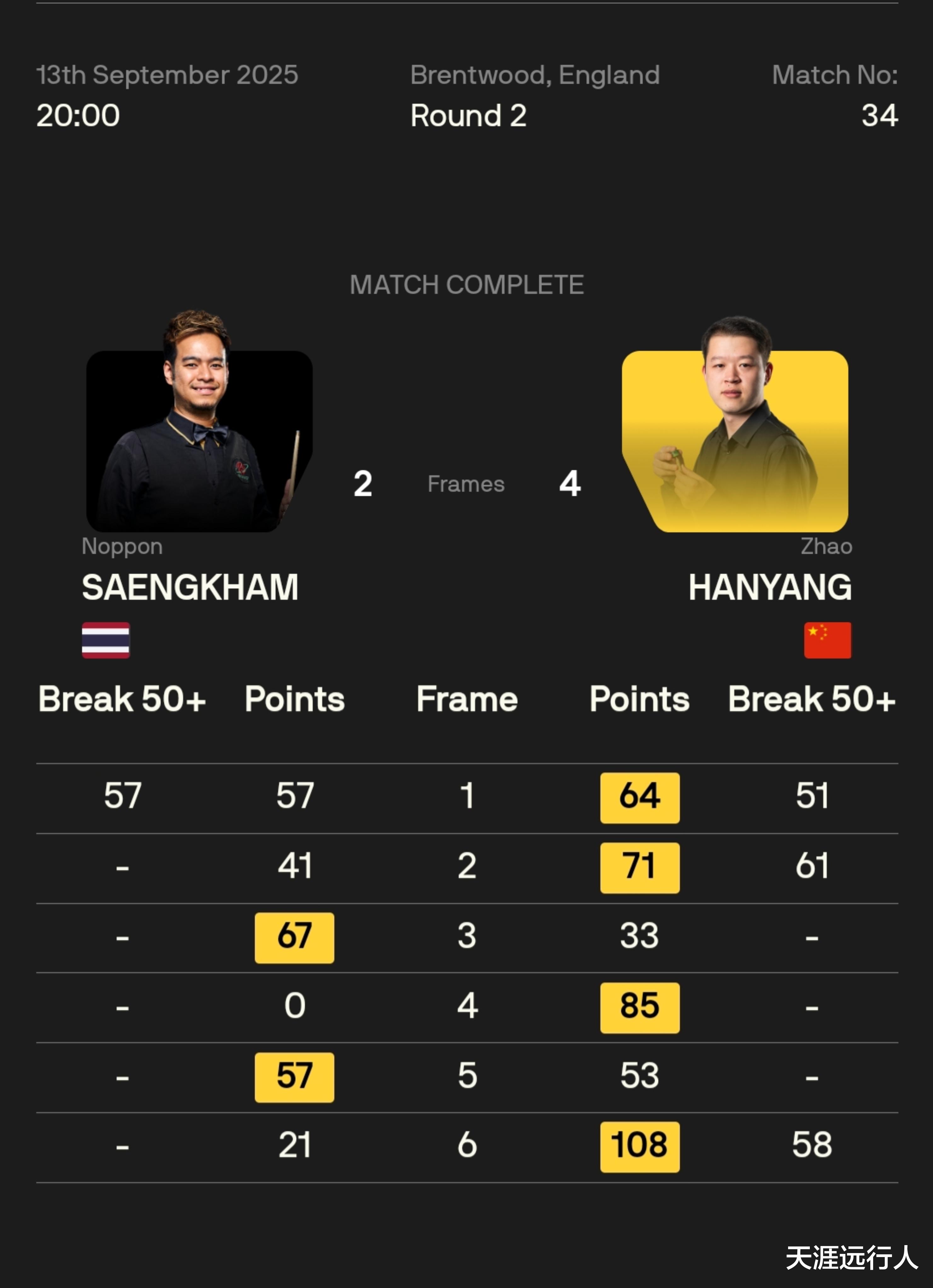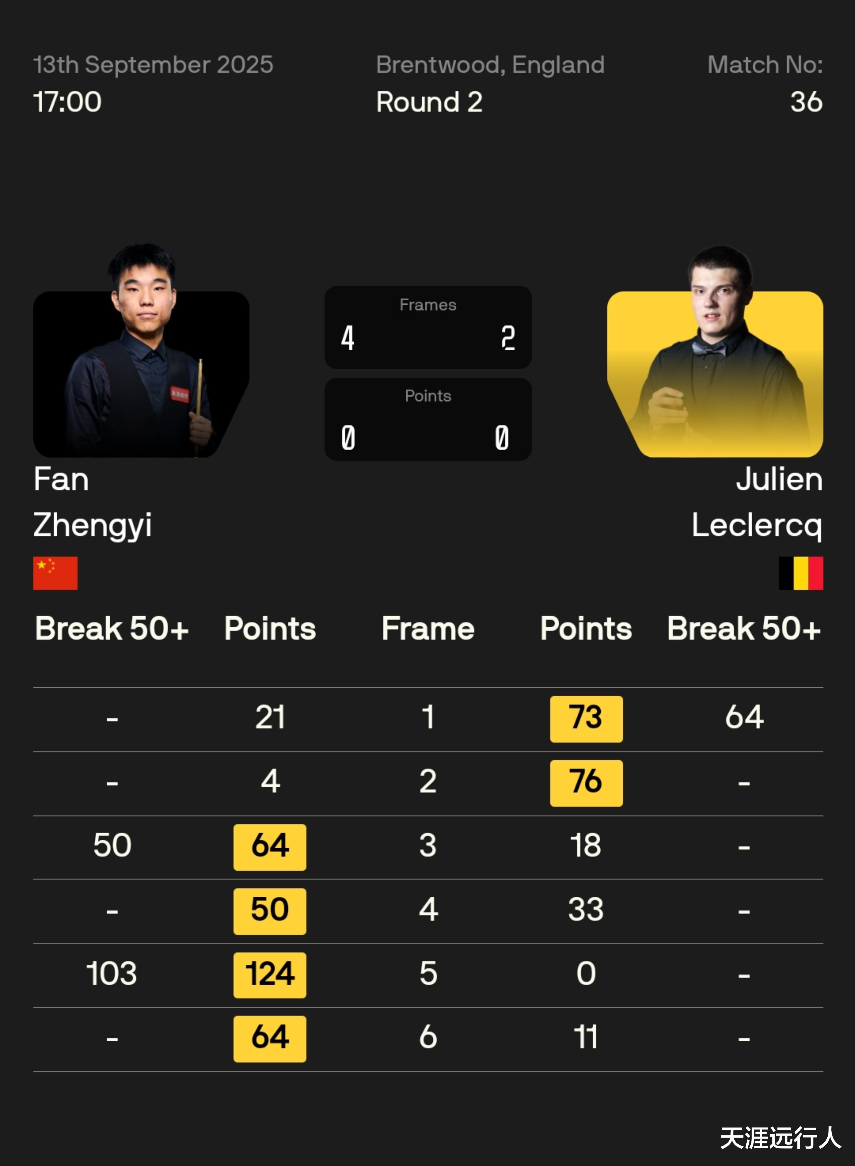北京时间9月14日凌晨5时39分,2025斯诺克英格兰公开赛第二轮96进64轮次前半程的16场角逐,全部决出了胜负。