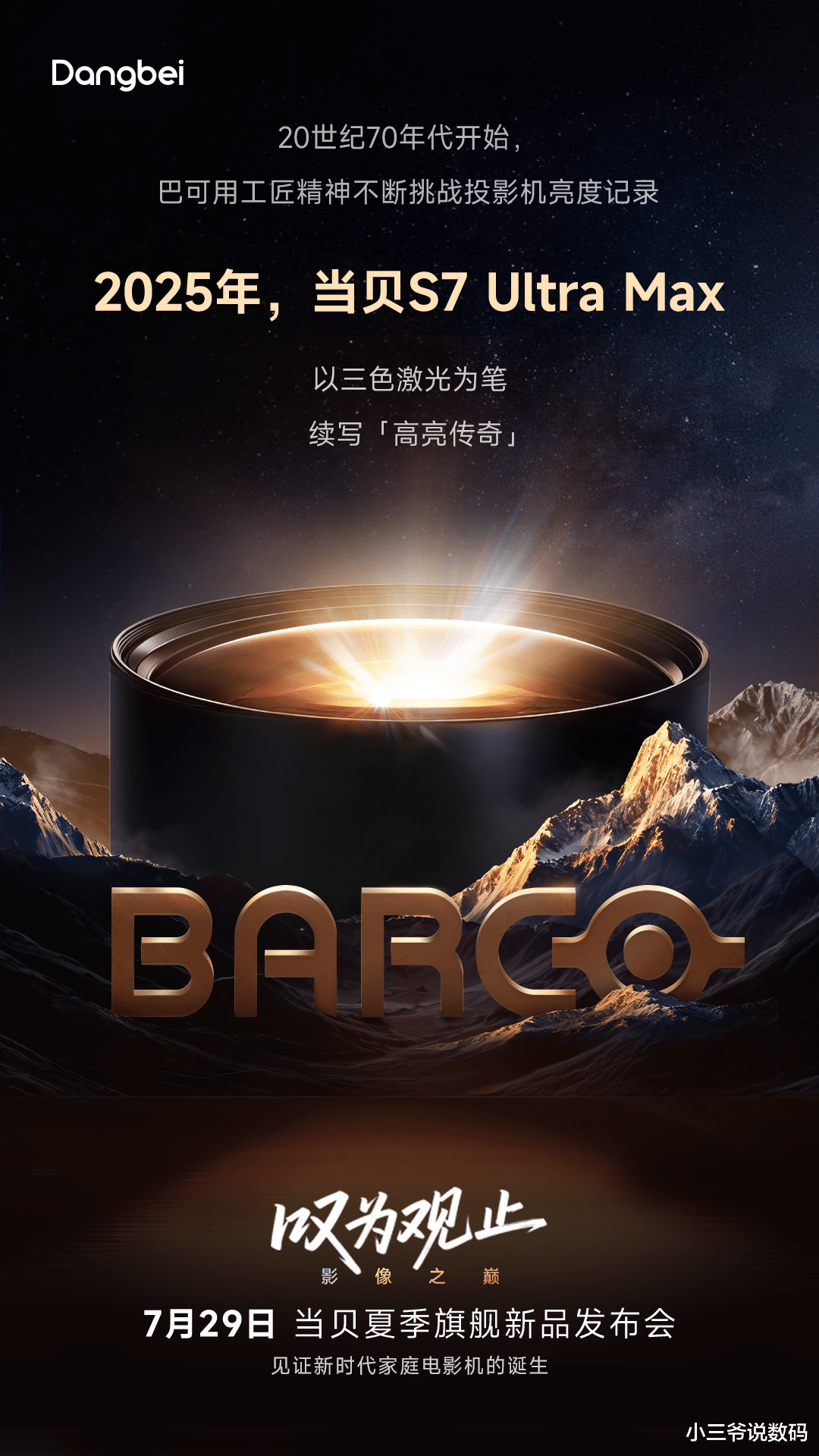 还有四天,当贝S7 Ultra Max 就要正式揭开神秘面纱。它能否真的如海报所暗示,在亮度表现上媲美甚至超越巴可曾经创造的辉煌,成为家庭投影领域新的高亮王者?它的三色激光技术在实际应用中还隐藏着哪些黑科技?让我们一起满怀期待,等待7月29日,见证新时代家庭4K杜比电影机的诞生,看当贝如何在高亮投影的赛道上,书写属于自己的传奇篇章!