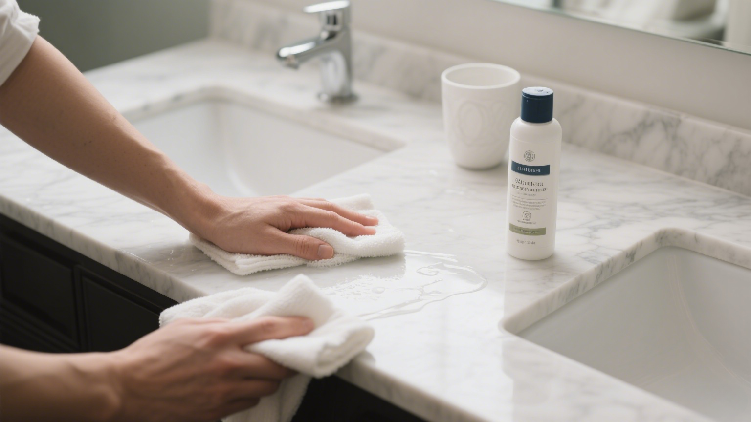 一、准备清洁工具与预处理先戴上一次性手套保护手部,避免清洁剂刺激皮肤;将台面上的洗漱杯、牙刷等物品移开,用干抹布擦去表面浮尘和积水,防止清洁时污渍扩散;准备中性清洁剂(避免用酸性清洁剂损伤大理石台面)、海绵擦(粗面用于去顽固污渍,细面用于收尾擦拭)、旧抹布;若台面污渍较厚,可先在污渍处喷洒清洁剂,静置 2 分钟软化污垢。