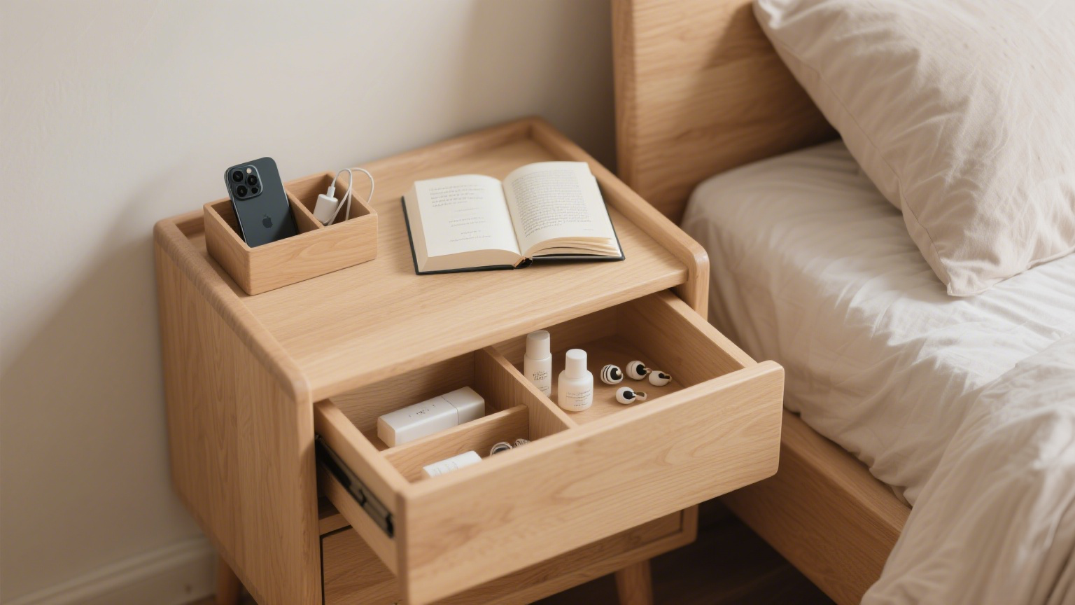 二、分区规划摆放按 “方便取用” 原则分区摆放:① 床头柜表面(仅放 3-4 件常用物品):左侧用带分隔的收纳盒收纳手机、充电器,避免电线缠绕;右侧放当天阅读的睡前读物,保持封面朝上,方便拿取;② 床头柜抽屉(分层收纳):用抽屉隔板分成 2-3 个区域,分别放置护肤品(如眼霜、唇膏)、偶尔使用的耳塞、备用眼镜,避免物品混杂;③ 床头柜侧面(利用垂直空间):可粘贴挂钩,挂耳机、眼镜布,进一步节省表面空间。