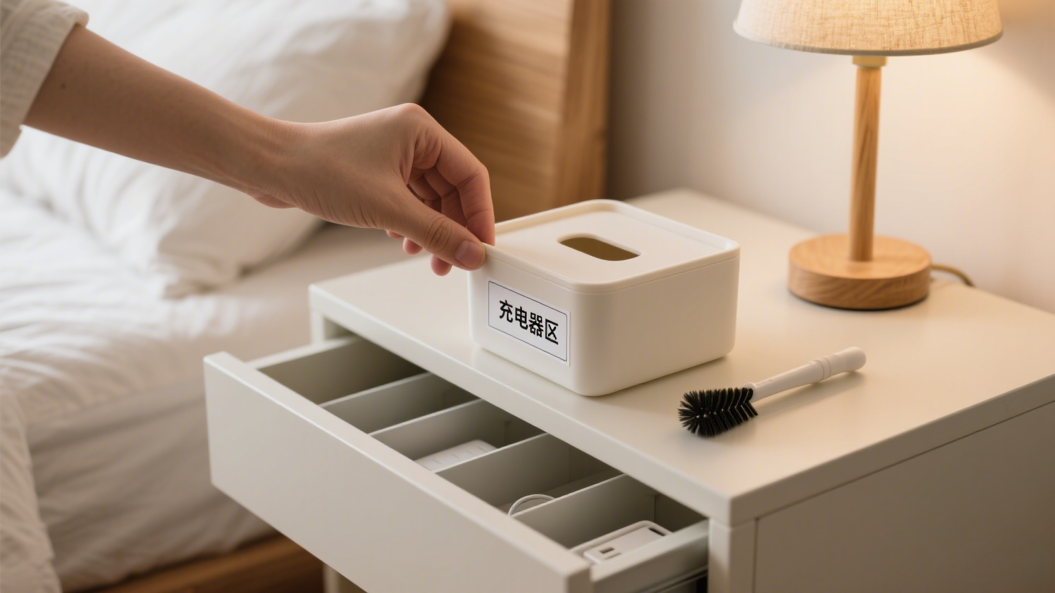 三、细节优化防乱最后做细节优化:① 用迷你除尘刷清理床头柜表面缝隙和抽屉角落灰尘,避免积灰影响整洁;② 给收纳盒、抽屉隔板贴简单标签(如 “充电器区”“护肤品区”),尤其适合多人共用床头柜的家庭,避免拿错物品;③ 制定 “睡前归位” 习惯,每天睡前将手机、眼镜等物品放回对应区域,每周花 3 分钟简单整理,防止再次杂乱。