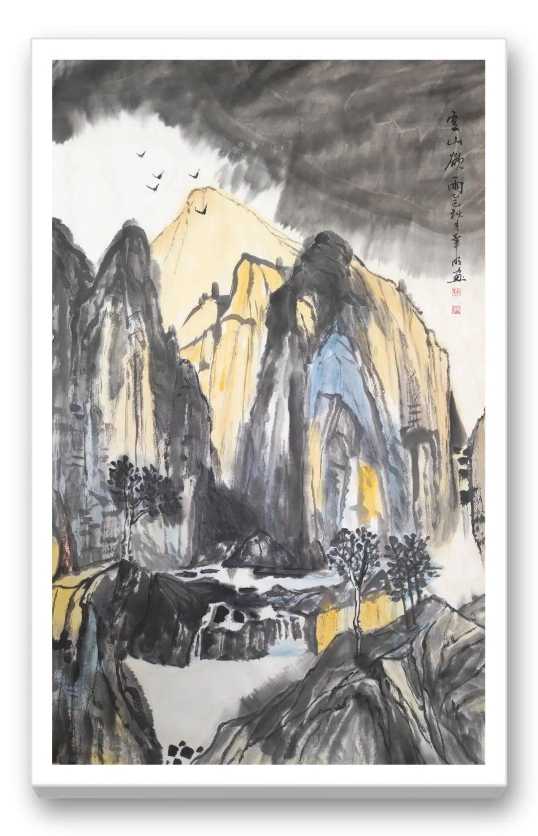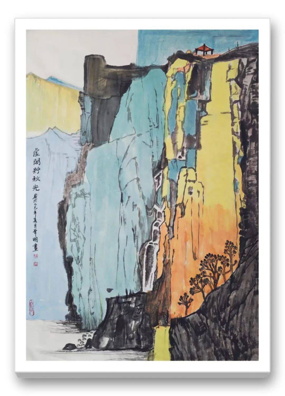 而在墨与彩的关系处理上,聂华明老师突破了传统山水画“水墨为上”的固有模式,大胆且巧妙地运用色彩,使画面焕发出新的生机。传统山水画的色彩多为浅绛、青绿等较为素雅的色调,以辅助水墨营造意境。但聂老师的作品中,色彩不再是水墨的附属,而是与水墨相互交融、相互映衬的重要元素。画面中的山壁,一侧是澄澈的蓝,一侧是暖调的黄与橙,色彩的碰撞既形成了强烈的视觉冲击,又通过水墨的调和,让色彩过渡自然,不显突兀。蓝色的冷寂与黄橙的暖融,恰似秋光中的清寒与和煦并存,既展现出秋天特有的节气氛围,又在色彩的对比中,赋予了画面现代艺术的形式美感,使传统山水在色彩的助力下,更具时代气息。