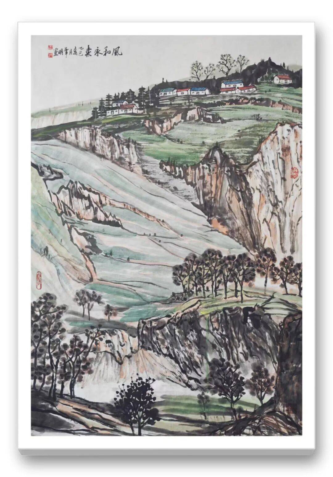 从构图来看,聂华明老师的山水画既遵循传统山水画“高远”“深远”“平远”的构图法则,又融入了现代构成意识。传统构图注重画面的开合、主次、呼应,以营造出“可行、可望、可游、可居”的意境。聂老师采用高远与平远结合的构图,近景是陡峭的山崖,中景是蜿蜒的河流与错落的屋舍,远景是连绵的山峦,层次分明,让观者的视线能在画面中自由游走,仿佛真的置身于那开阔清朗的山水之间。同时,他又巧妙运用现代构成的理念,对画面中的元素进行提炼与重组。在《夏山清凉》里,山体的形态被概括成富有韵律的块面,树木、屋舍等点缀其间,既保留了山水的自然形态,又通过块面的大小、色彩的对比等构成手法,使画面具有强烈的形式感,让传统山水的意境表达更具现代视觉张力。