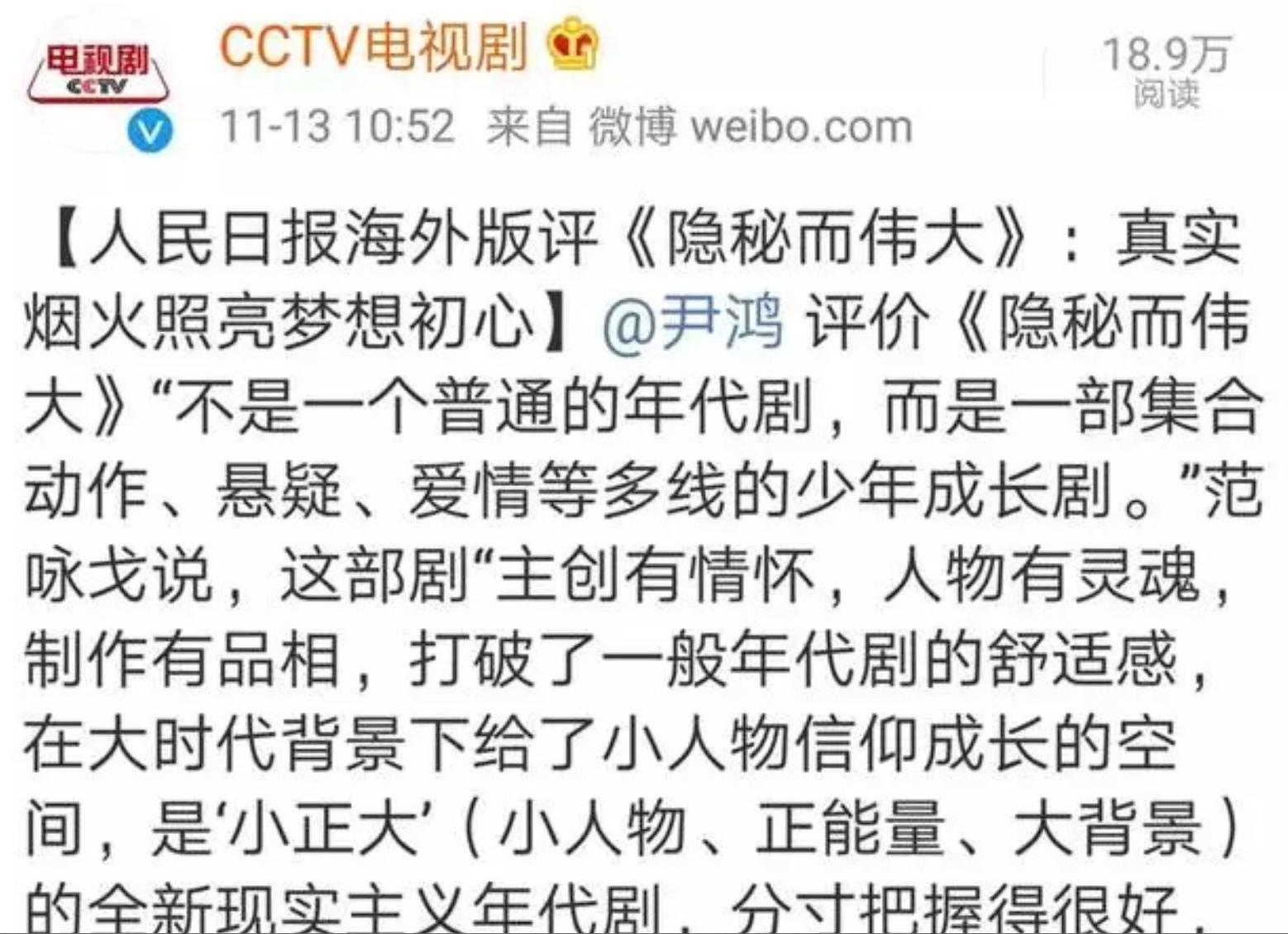 就连官媒人民日报海外版也对这部剧作了点评:“《隐秘而伟大》不是一个普通的年代剧,而是一部集合动作、悬疑、爱情等多线的少年成长剧。”