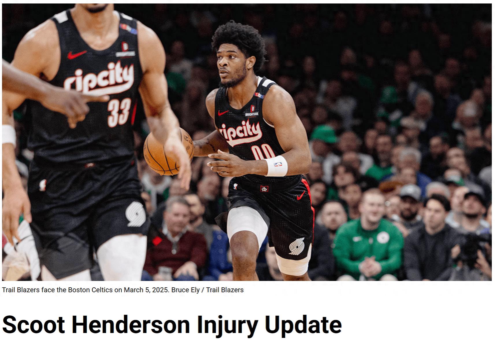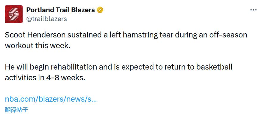 开拓者官方更新社交媒体,报道亨德森的伤情。开拓者队写道:亨德森在本周的一次休赛期训练中左腿腿筋撕裂。他将开始进行康复训练,预计将在4-8周后重返篮球活动。