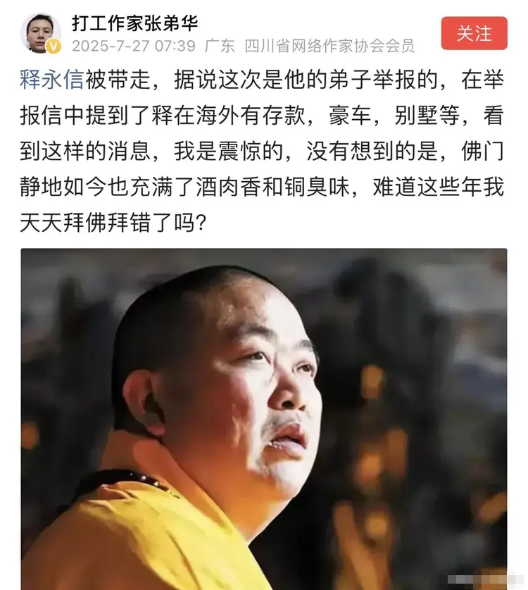 此外,有博主爆料称,释永信被带走,据说这次是他的弟子举报的,在举报信中提到了释在海外有存款,豪车,别墅等。看到这样的消息,我是震惊的,没有想到的是,佛门静地如今也充满了酒肉香和铜臭味,难道这些年我天天拜佛拜错了吗?