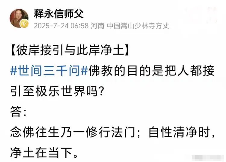 7月24日,释永信的社交媒体账号“释永信师父”还曾发布了一篇题为《彼岸接引与此岸净土》的微头条,内容如下: