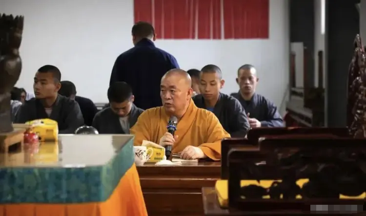 值得一提的是,7月7日,释永信还召集少林寺僧人开会,学习登封佛教人士因私出国管理办法,强调遵纪守法。这张照片显示,释永信没有坐在上面,而是坐在下面跟僧人一起。