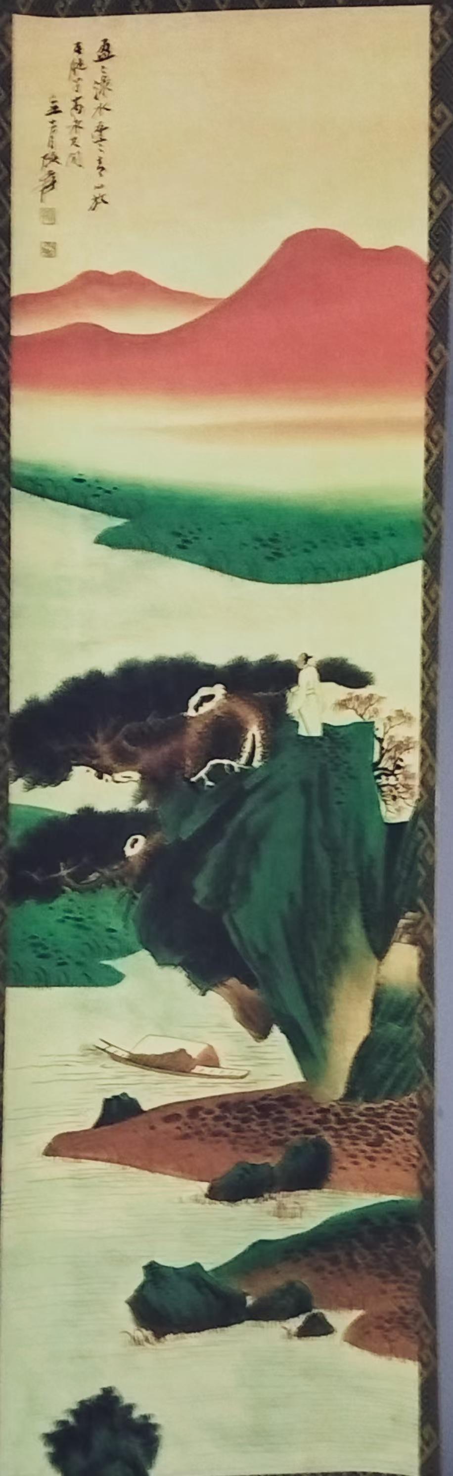 **“色彩的主观性表达”**是此轴的核心:张大千摒弃了传统青绿山水“随类赋彩”的约束,以朱砂泼山,并非对“红山”的写实,而是对“心境”的抒发——那片红色,是高士对天地的热忱,是画家对生命的礼赞。同时,他以“水墨的厚重”平衡“色彩的张扬”:苍松的浓黑、江水的淡墨,如锚点般稳住了画面的视觉重心,避免了色彩的失控,体现了他“狂而不野,放而不肆”的艺术克制。