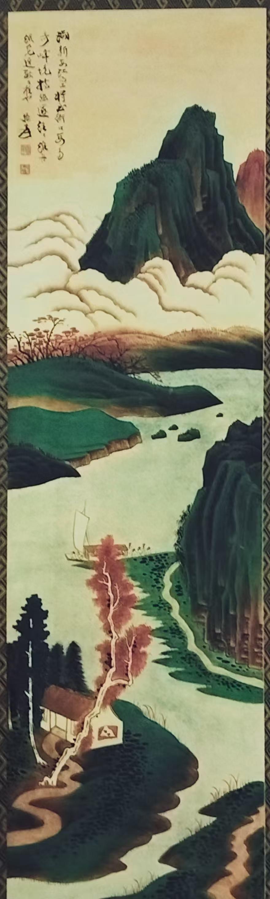 画面中,重峦叠嶂以浓墨泼就,再以石青、石绿破墨而出;云涛如棉絮翻涌,以淡赭、米黄晕染,形成强烈的明暗对比;江面上孤帆远影,岸边红树茅舍,在泼彩的混沌中勾勒出清晰的细节。