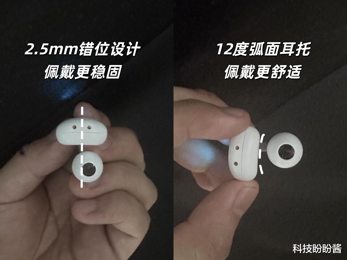 佩戴体验:采用了前高后低的2.5mm 错位设计,能恰好贴合耳朵形状,让佩戴更稳固;电池部分则做成∠12弧面耳托,可完美贴合耳背,进一步提升贴合度与舒适度。单耳仅 4.5g 的重量,佩戴起来不夹耳,几乎无感。