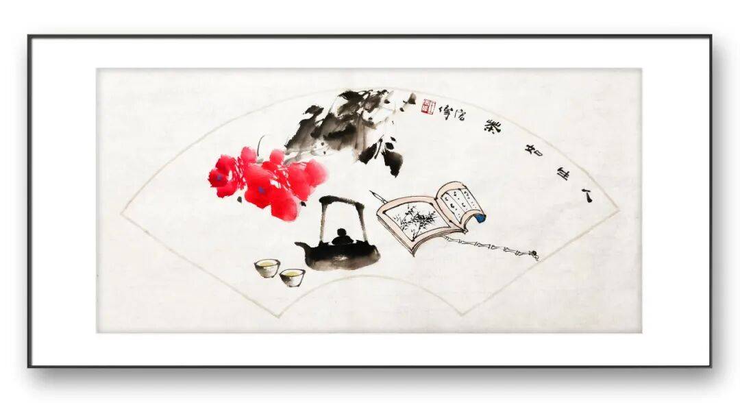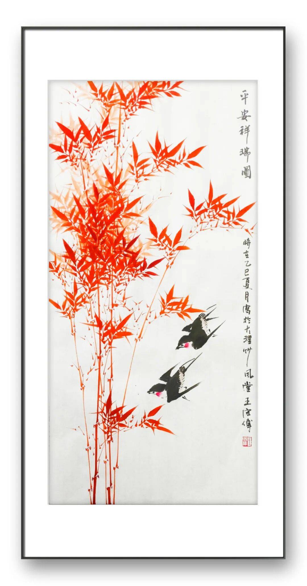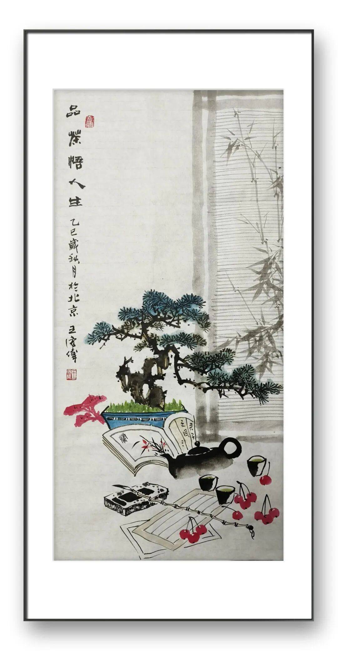 在传承中创新,是王宏伟竹画的鲜明特质。他善用散点式构图,让竹枝疏密有致、虚实相映,于繁乱中见章法,于空灵中藏意境。画面中点缀的麻雀、茶具等元素,更成为点睛之笔——《竹雀图》中独立梢头的雀鸟,既暗合传统寓意,又注入生活气息,消解了古典竹画的孤寂感。他更突破水墨藩篱,以朱砂点染梅花与墨竹形成冷暖碰撞,用工笔青花瓶与写意修竹构成古今对话,甚至在光影处理中融入西方印象派的朦胧质感,在跨文化审美中拓展了文人画的视觉张力。