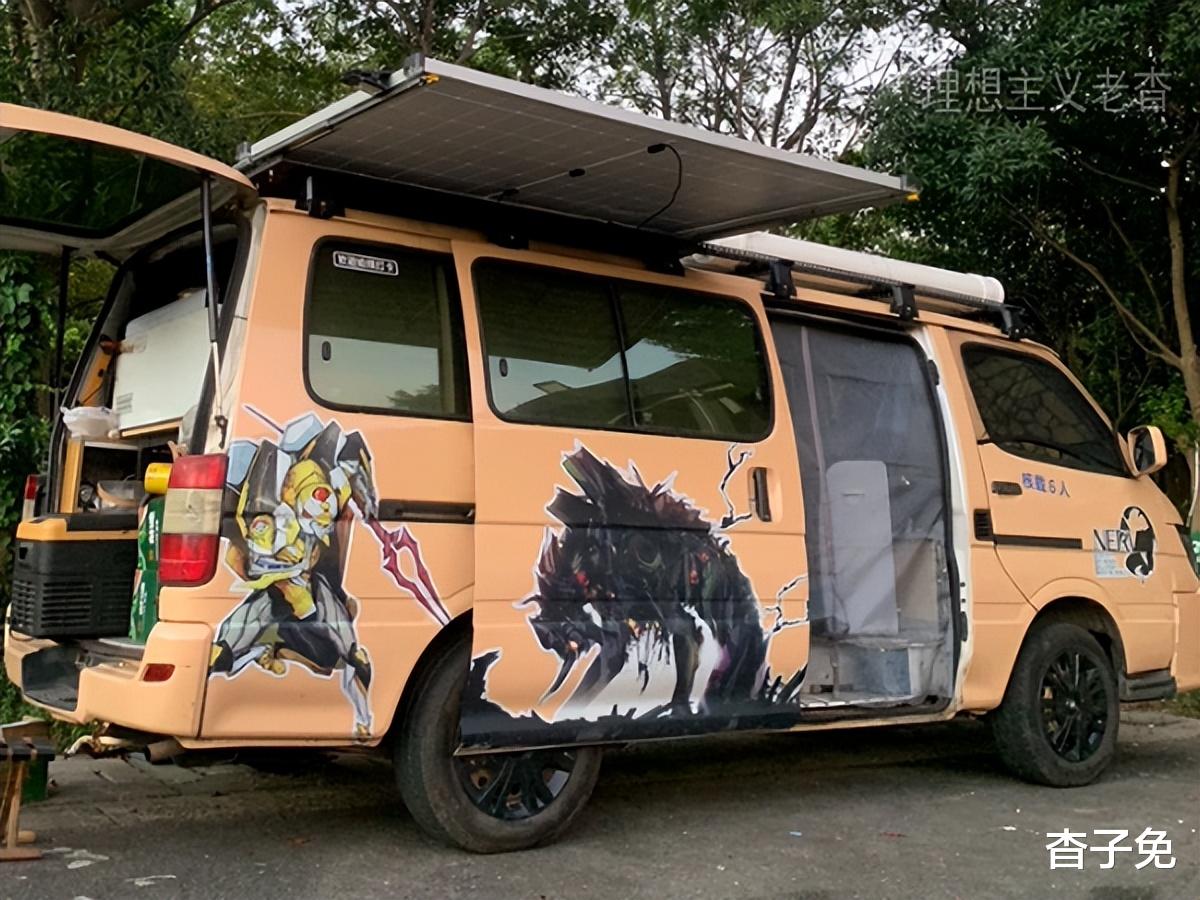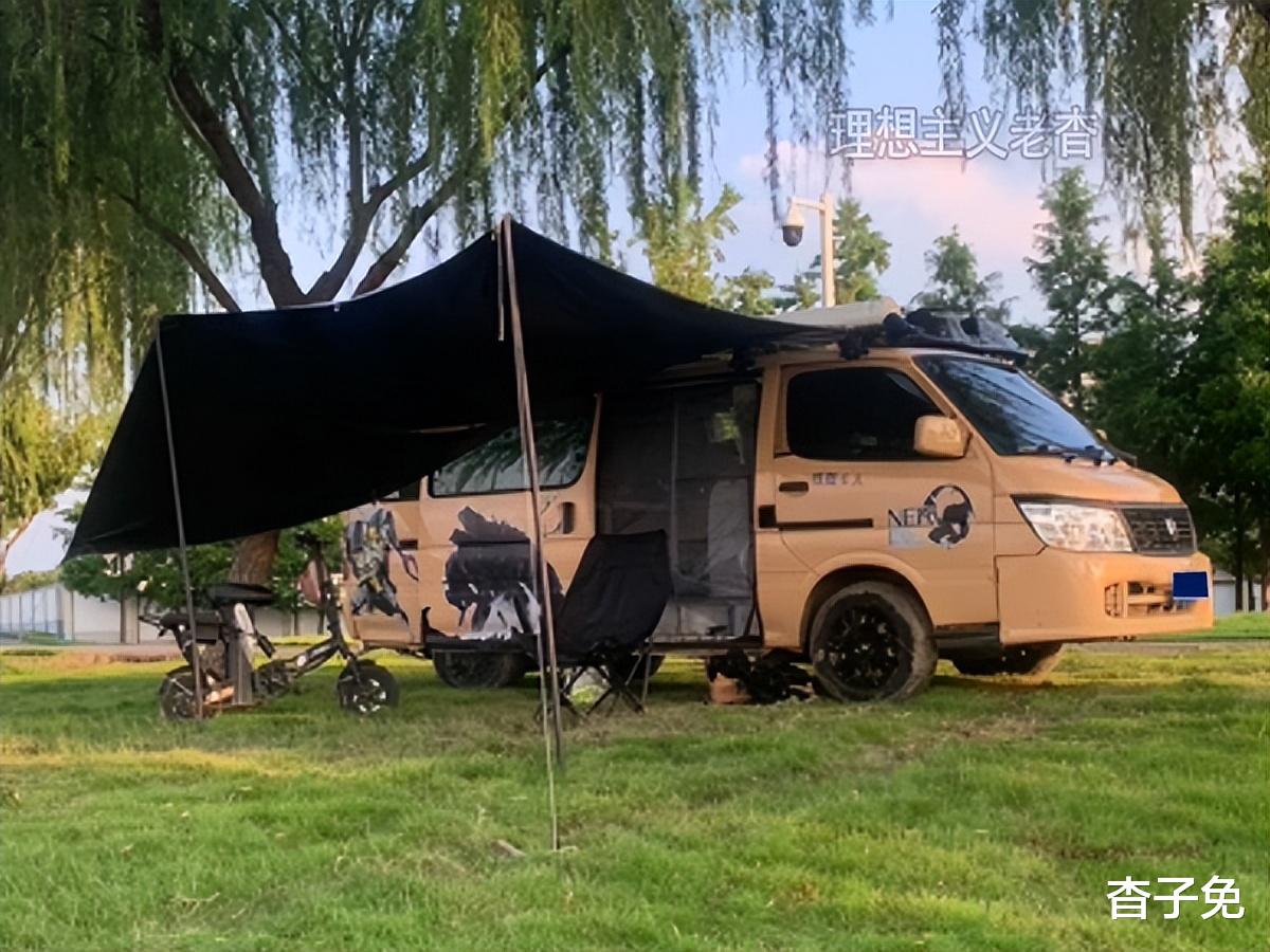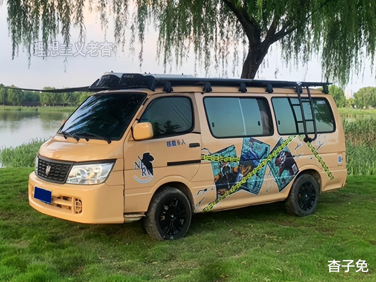 这是一台金杯海狮,汽油2.0L排量,手动5挡,4门6座,中轴低顶,车顶行李架上安装了太阳能板,左后配备了爬梯方便登顶,右上侧边帐为户外露营而设。