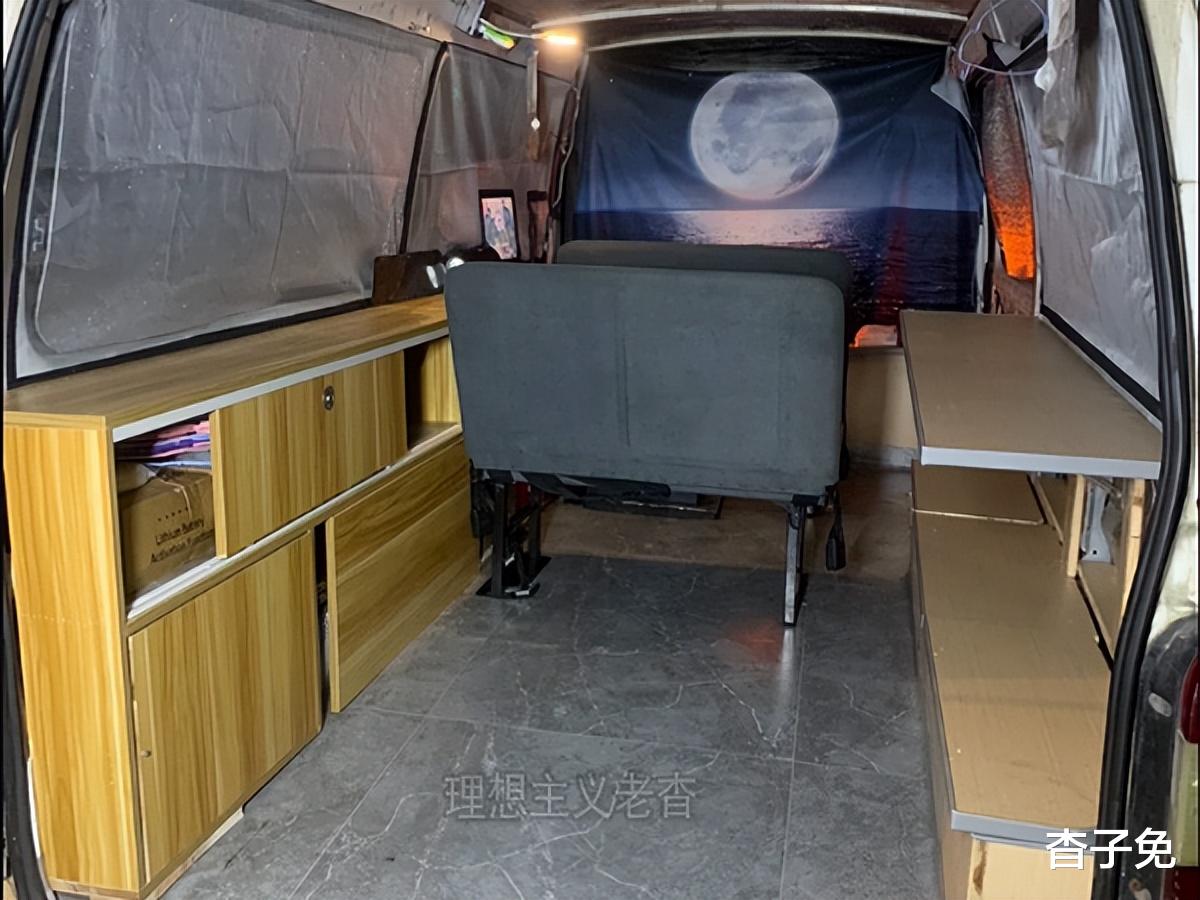 进入车内,中后排座椅换成了简易床车专用椅,左边是木柜,右边是吧台,玻璃窗隐私帘已拉上,前面还有落地帘遮挡。