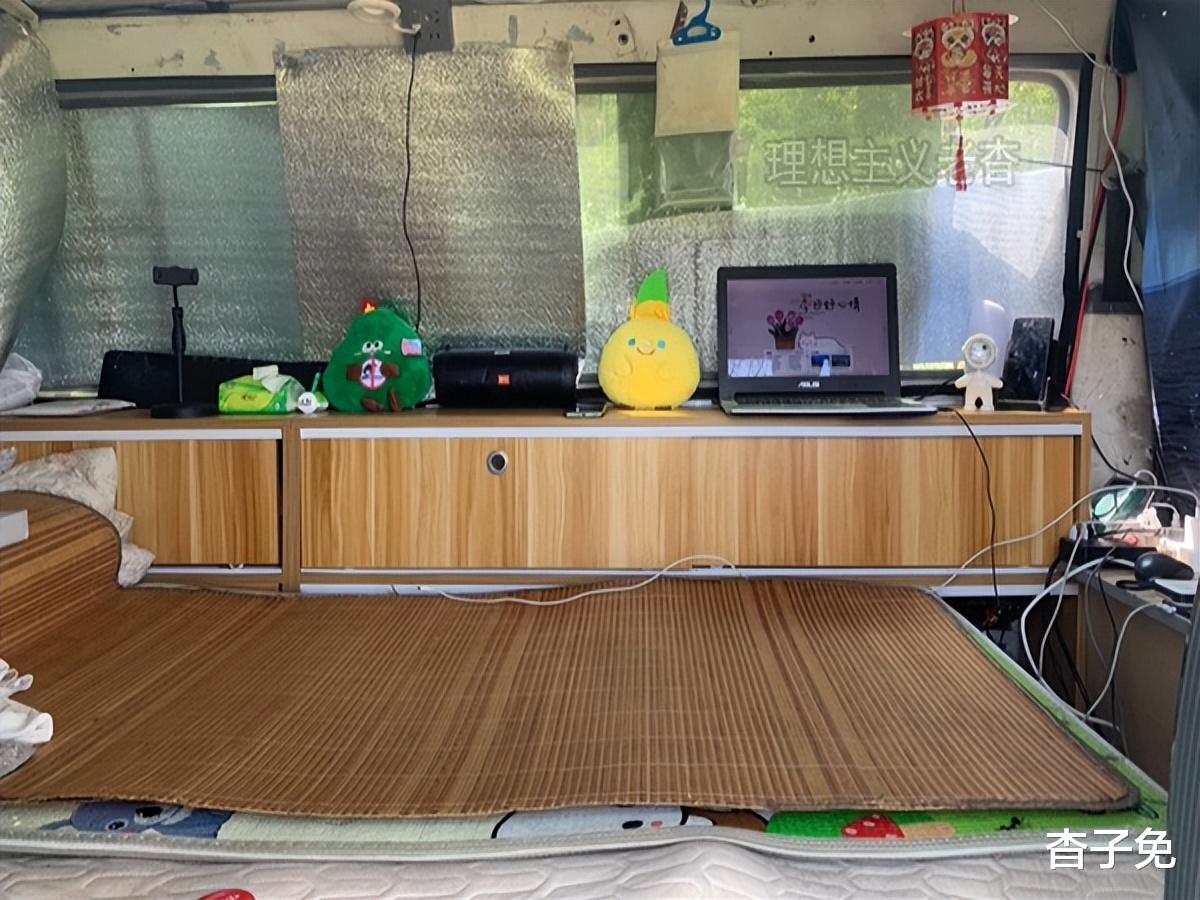 放平中后排座椅,就可拼成一张竖床,铺上凉席,打开电脑,车内席地办公。