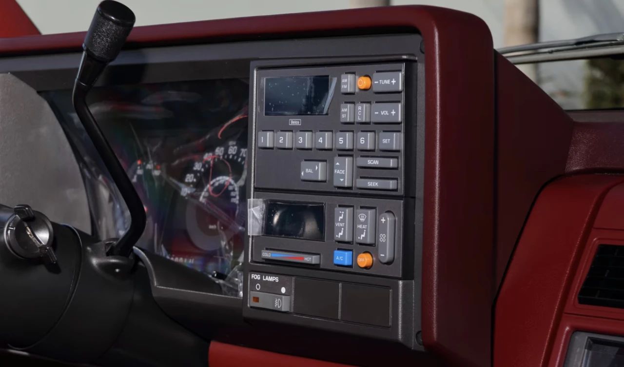 时至今日,原始的车窗贴纸仍然贴着。作为一款运动型皮卡,桶形座椅上仍然有原厂塑料保护膜覆盖,同样塑料保护膜也包裹着石榴红织布内饰以及仪表板。Onyx Black玛瑙黑车漆依旧闪闪发光,就像它最初交付给第一任主人那天一样。