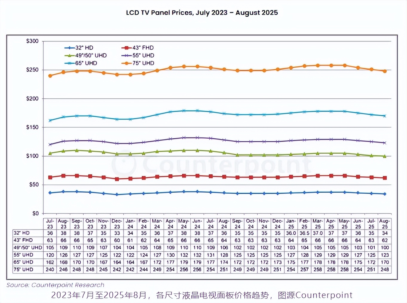 在面板行业进入“少数卖方主导市场”的格局后,头部企业能够实现 “按需生产”,进而掌握更强的产品定价权。如下图所示,自 2023 年,大尺寸面板价格其实已经基本告别了此前大起大落的周期性波动,大部分时间都保持稳定。