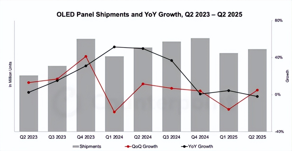 目前,OLED已是面板行业最确定的发展机遇。从数据上看,尽管今年二季度面临关税调整、厂商提前备货等不利因素,但根据Counterpoint Research数据,二季度全球 OLED 面板出货量仍实现了5%的环比增长。