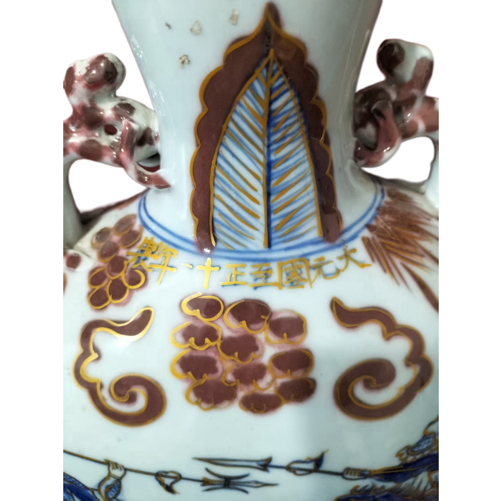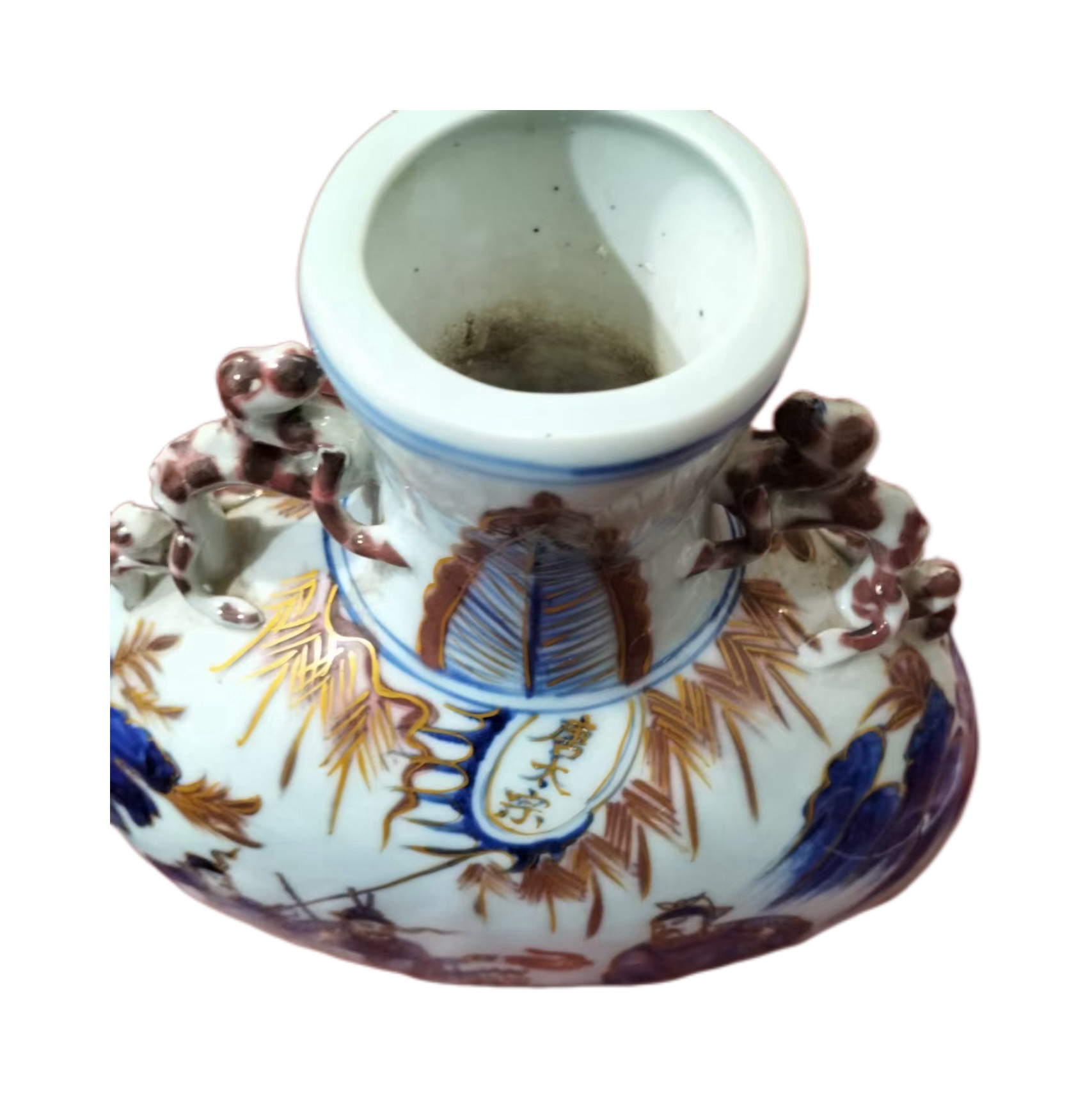 这只瓷瓶的造型设计十分独特,双耳采用了生动的动物造型,与瓶身的圆润相得益彰。双耳的制作工艺精湛,线条流畅,细节刻画入微,既起到了实用的作用,方便搬运,又具有极高的艺术价值,为瓷瓶增添了一份灵动之美。