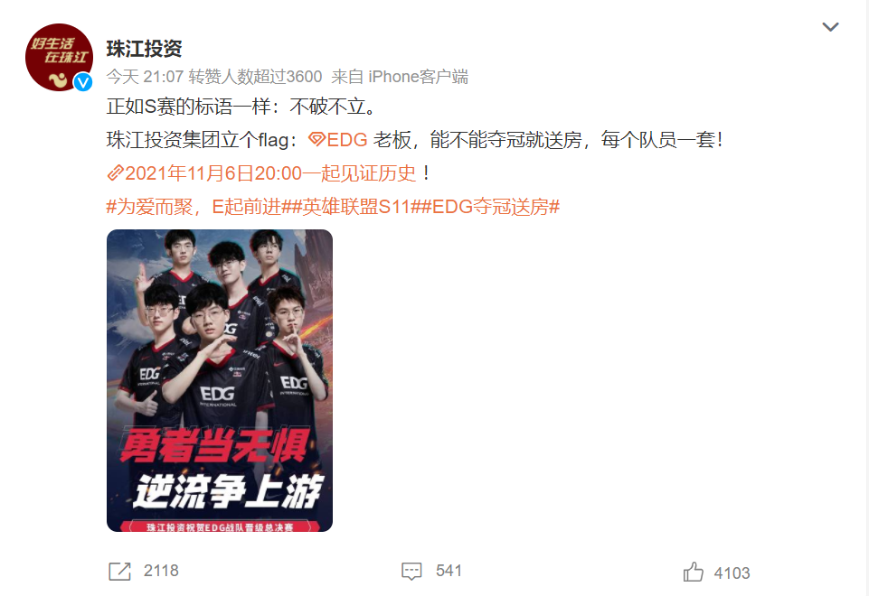 如果接下来EDG战队赢了,那么将会迎来最为终极的第五局比赛,而且还能够延长下大家观赛的时间。前两天EDG老板关联的公司方面就开了个玩笑,如果EDG战队拿了S11冠军,他们就送房给队员们。
