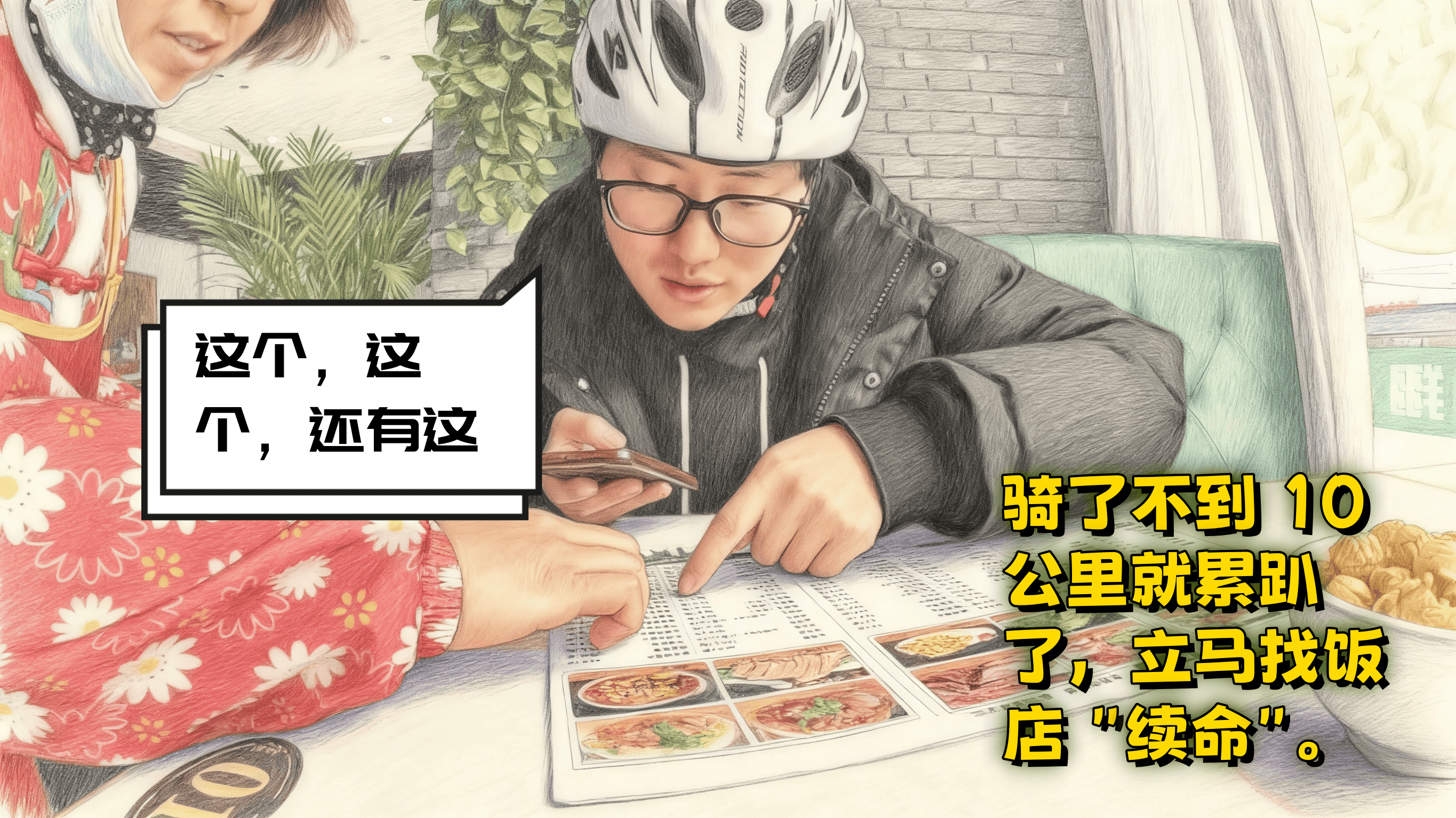 骑了不到 10 公里就累趴了,立马找饭店 "续命"。