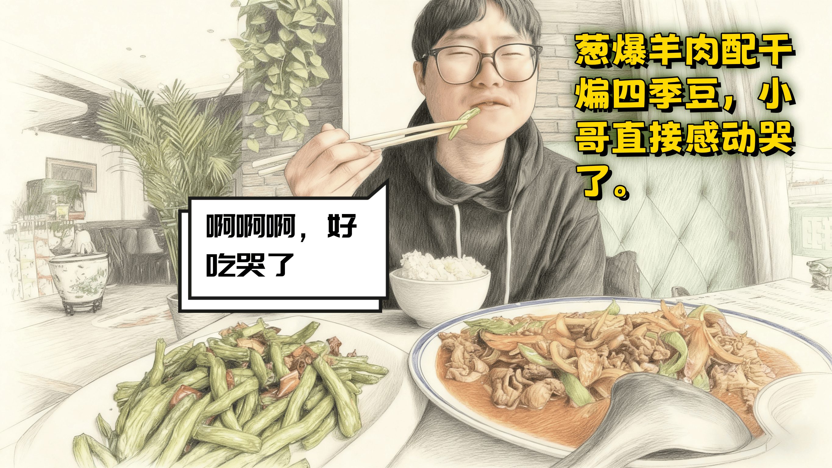 葱爆羊肉配干煸四季豆,小哥直接感动哭了。