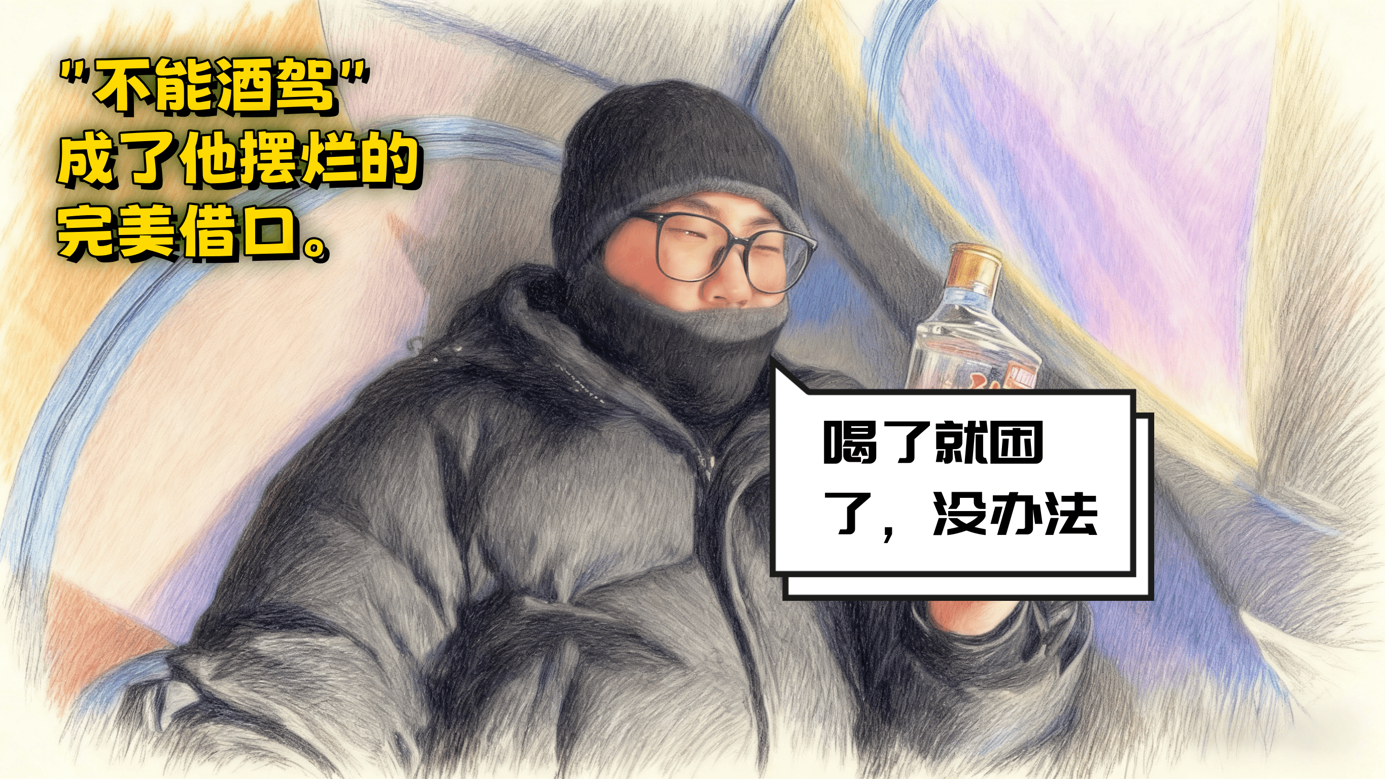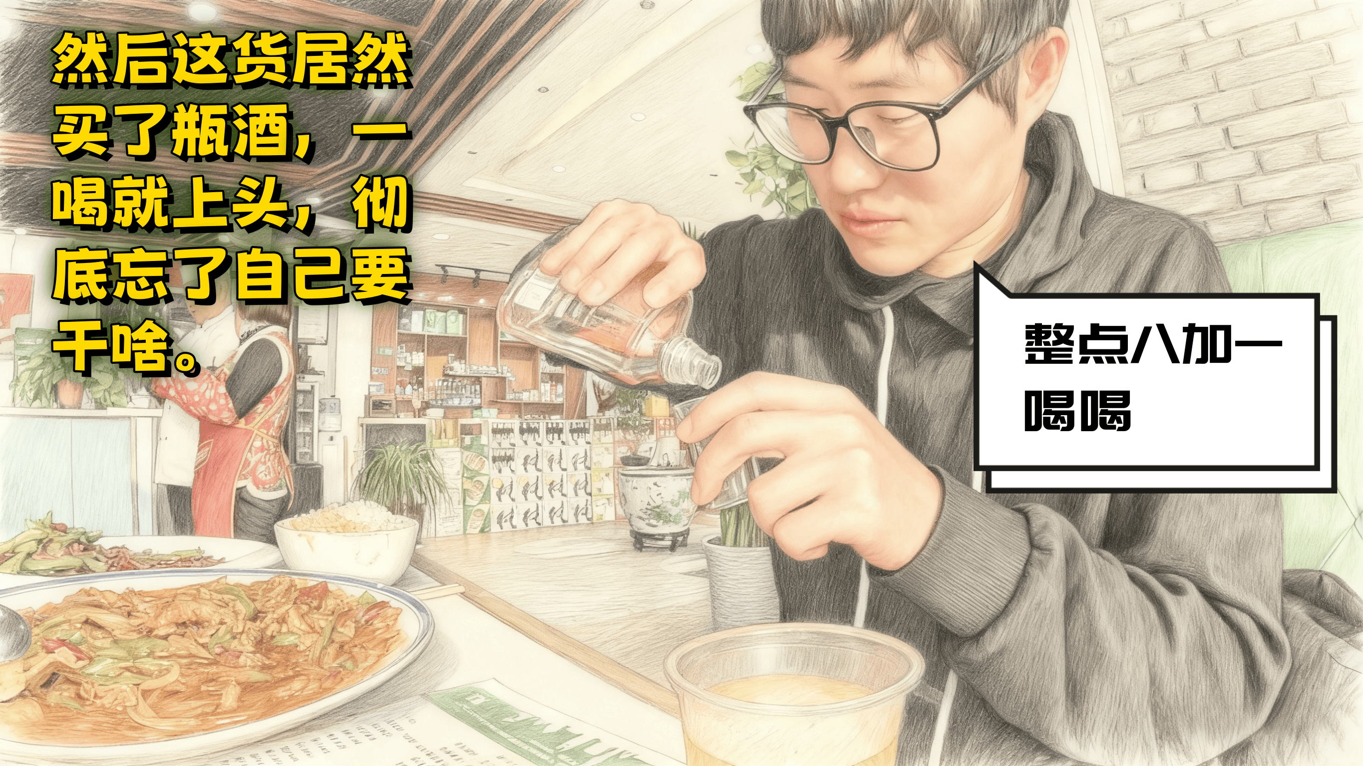 然后这货居然买了瓶酒,一喝就上头,彻底忘了自己要干啥。