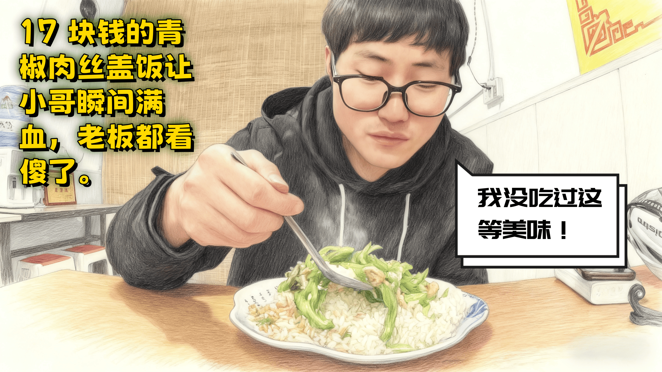 17 块钱的青椒肉丝盖饭让小哥瞬间满血,老板都看傻了。