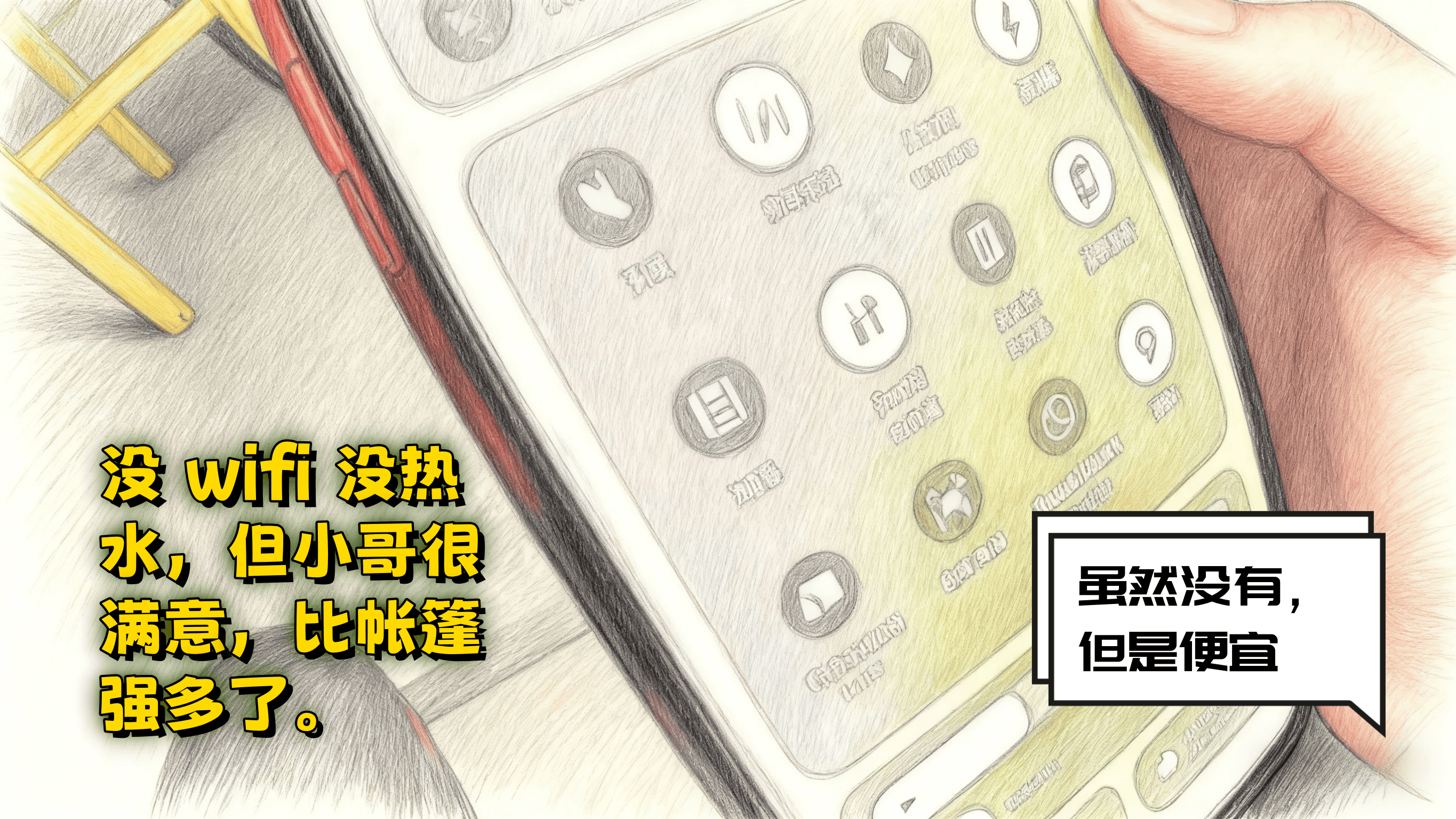 没 wifi 没热水,但小哥很满意,比帐篷强多了。