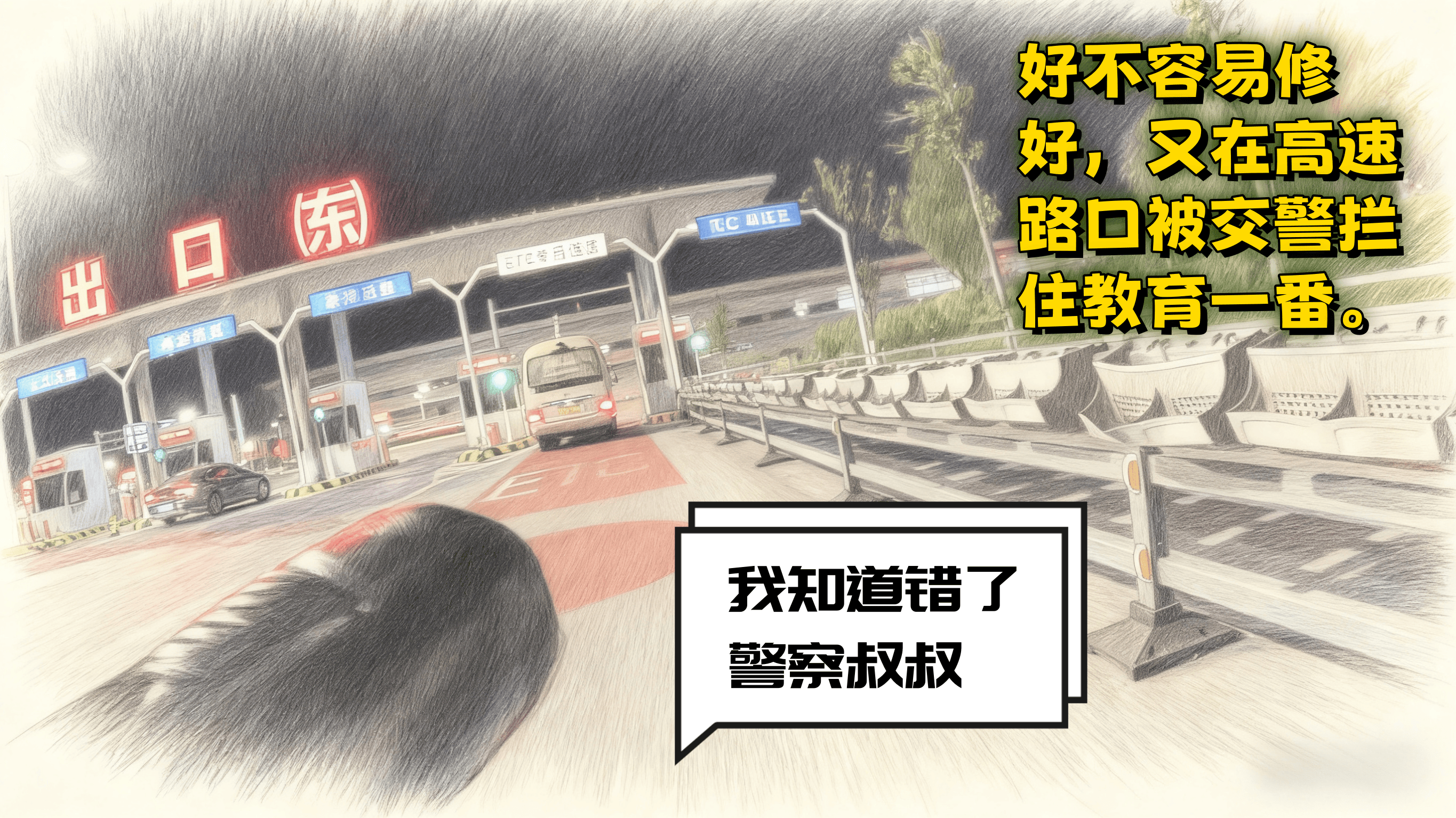 好不容易修好,又在高速路口被交警拦住教育一番。