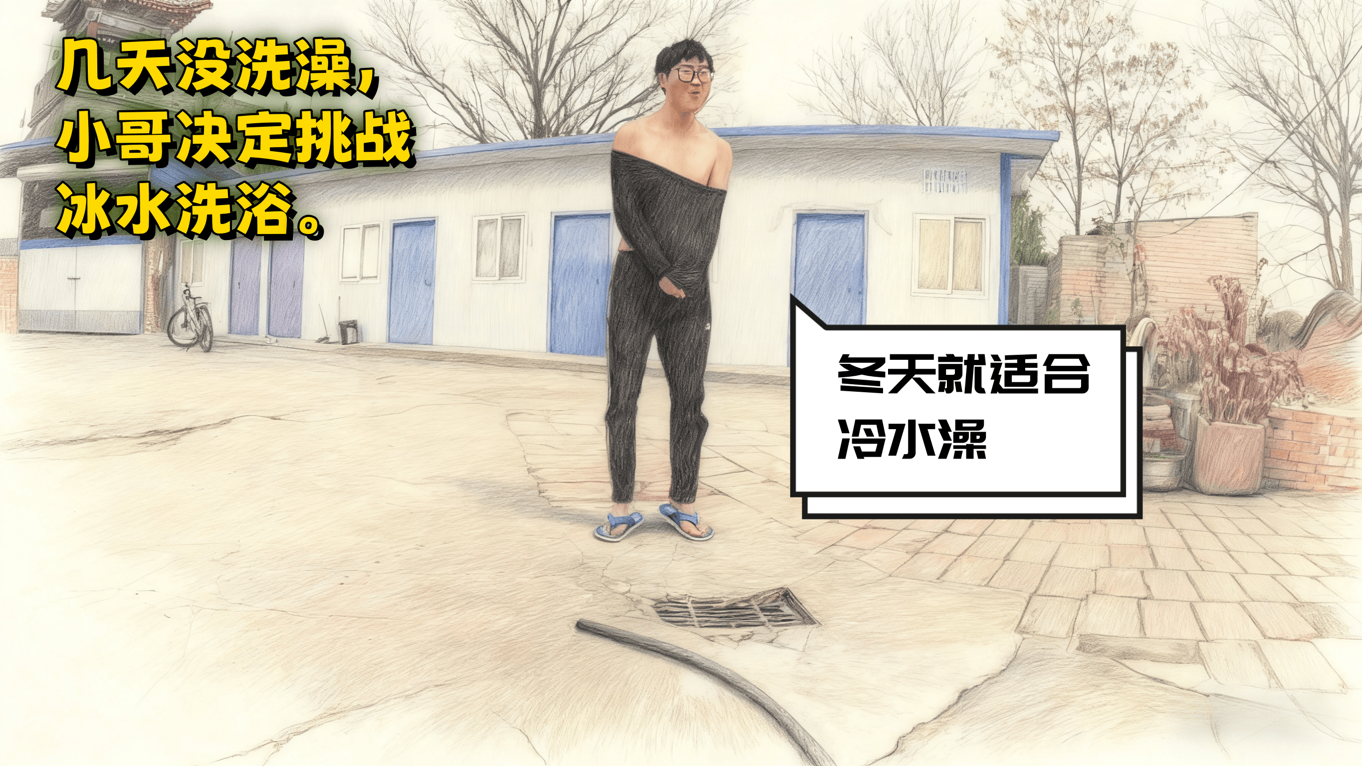 几天没洗澡,小哥决定挑战冰水洗浴。