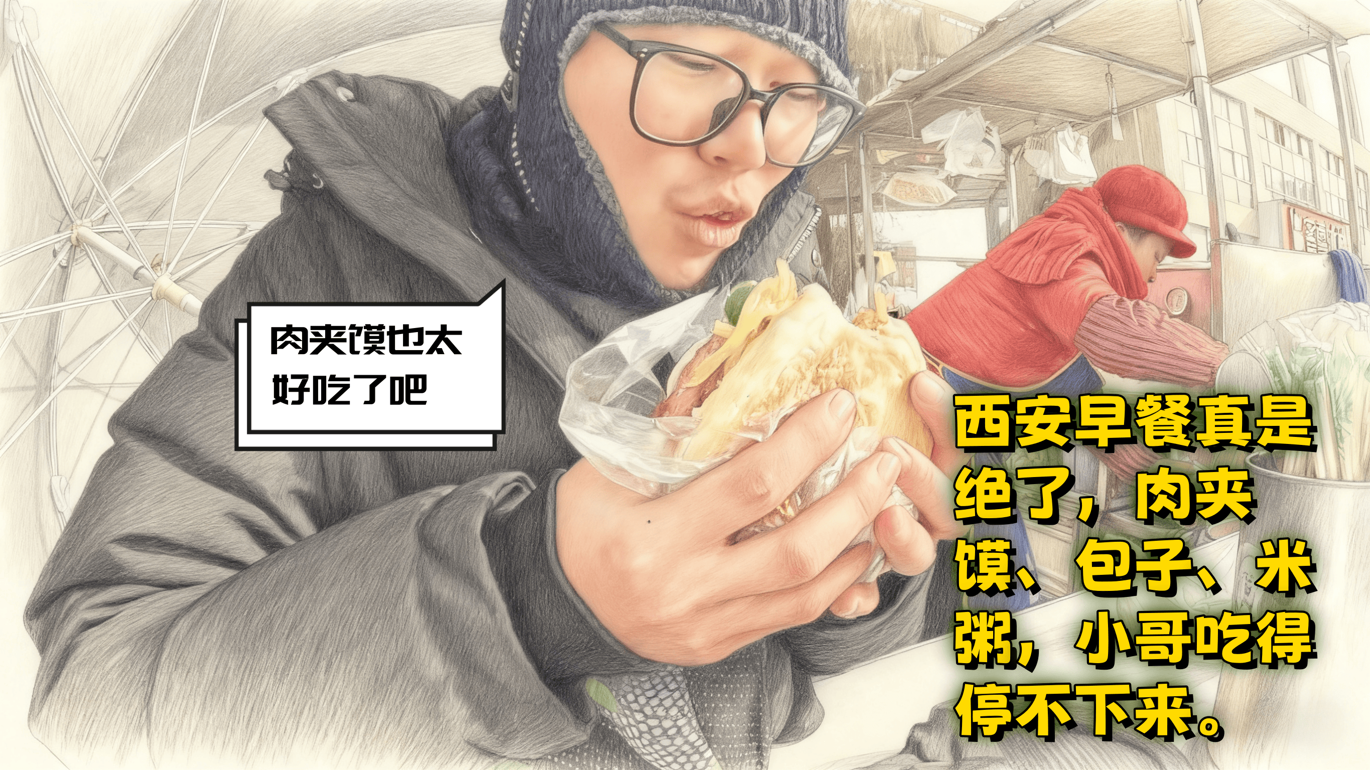 西安早餐真是绝了,肉夹馍、包子、米粥,小哥吃得停不下来。