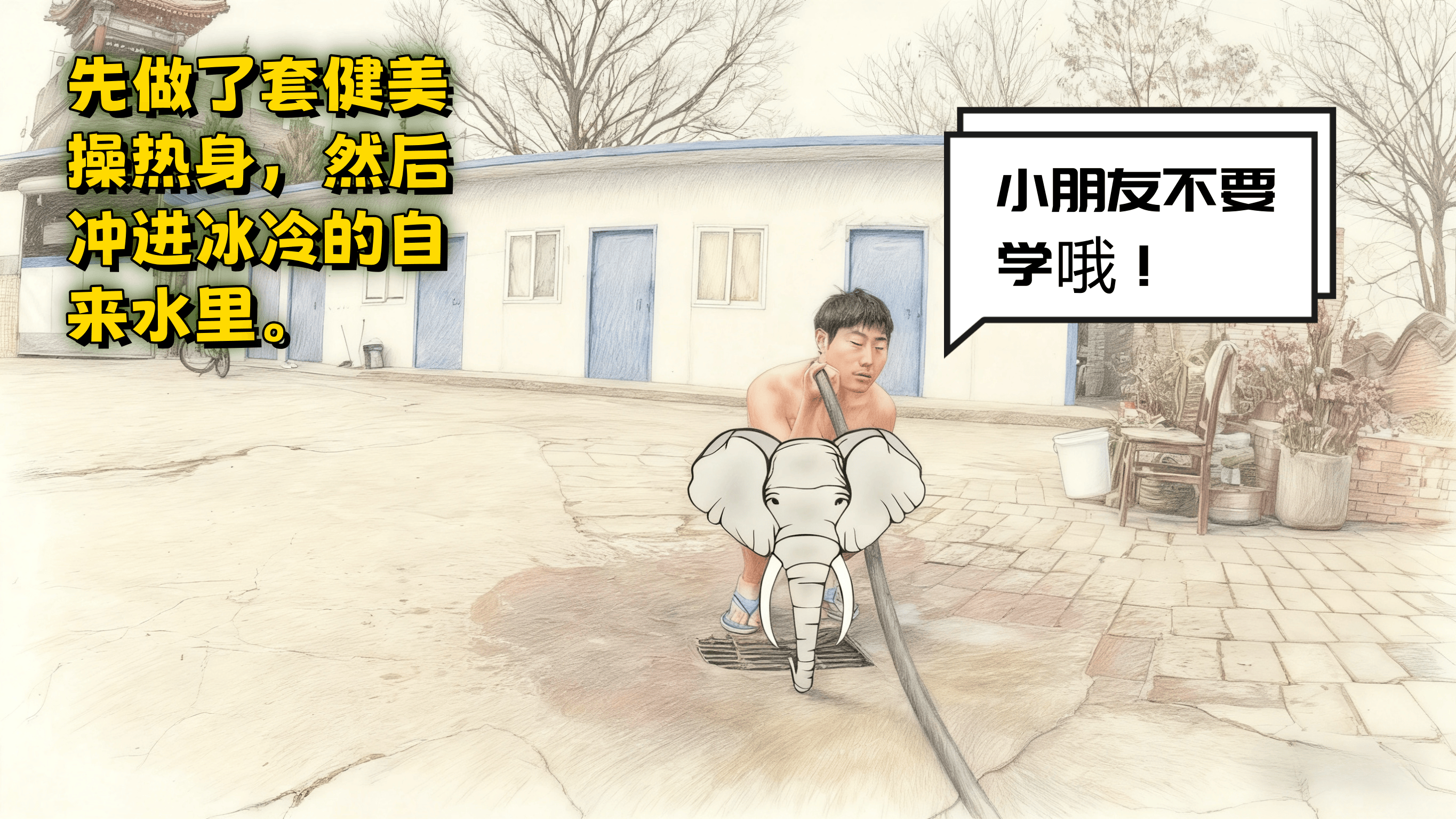 先做了套健美操热身,然后冲进冰冷的自来水里。