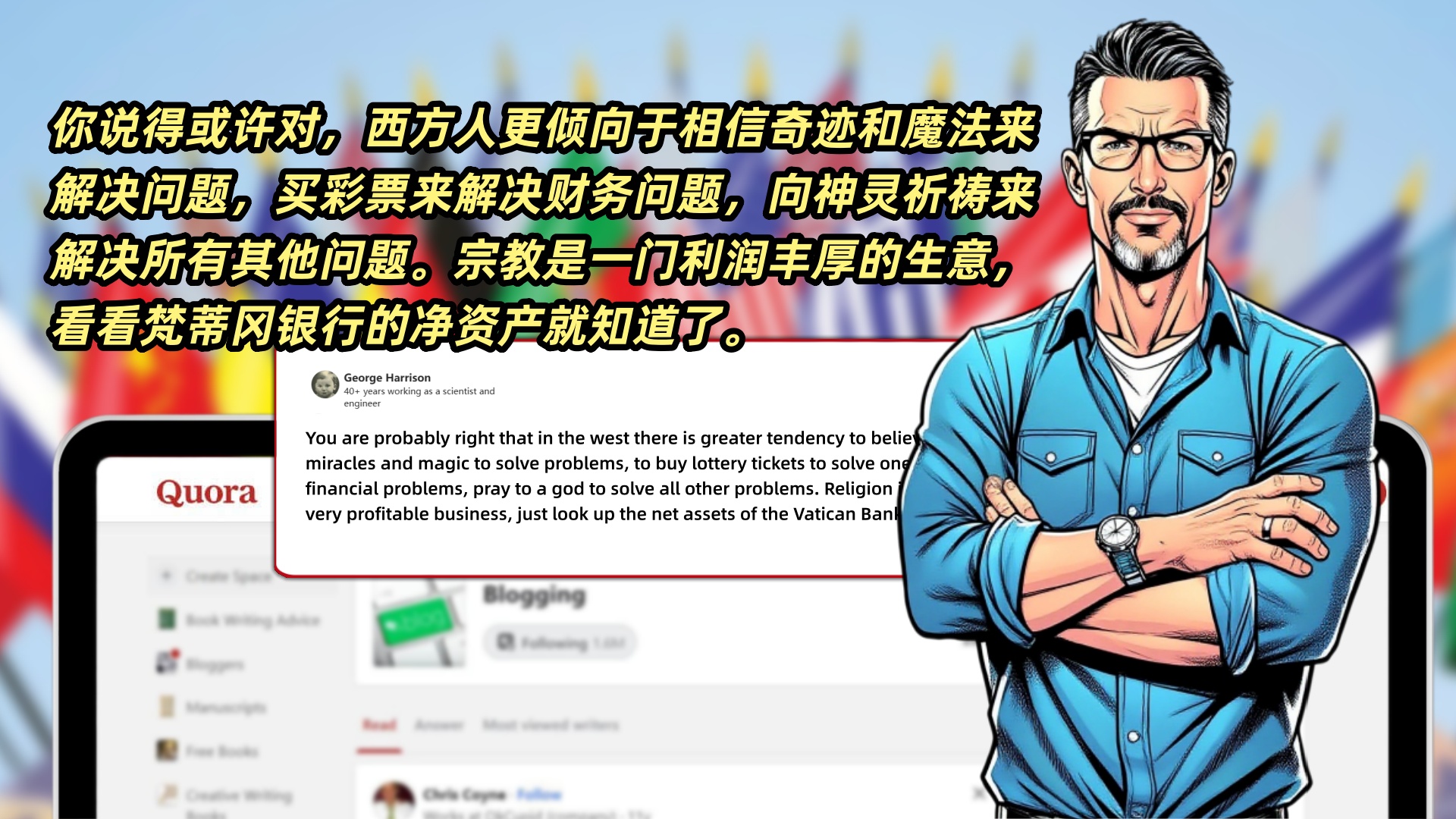 美国科学工程师George Harrison紧跟在下面表示同意:你说得或许对,西方人更倾向于相信奇迹和魔法来解决问题,买彩票来解决财务问题,向神灵祈祷来解决所有其他问题。宗教是一门利润丰厚的生意,看看梵蒂冈银行的净资产就知道了。