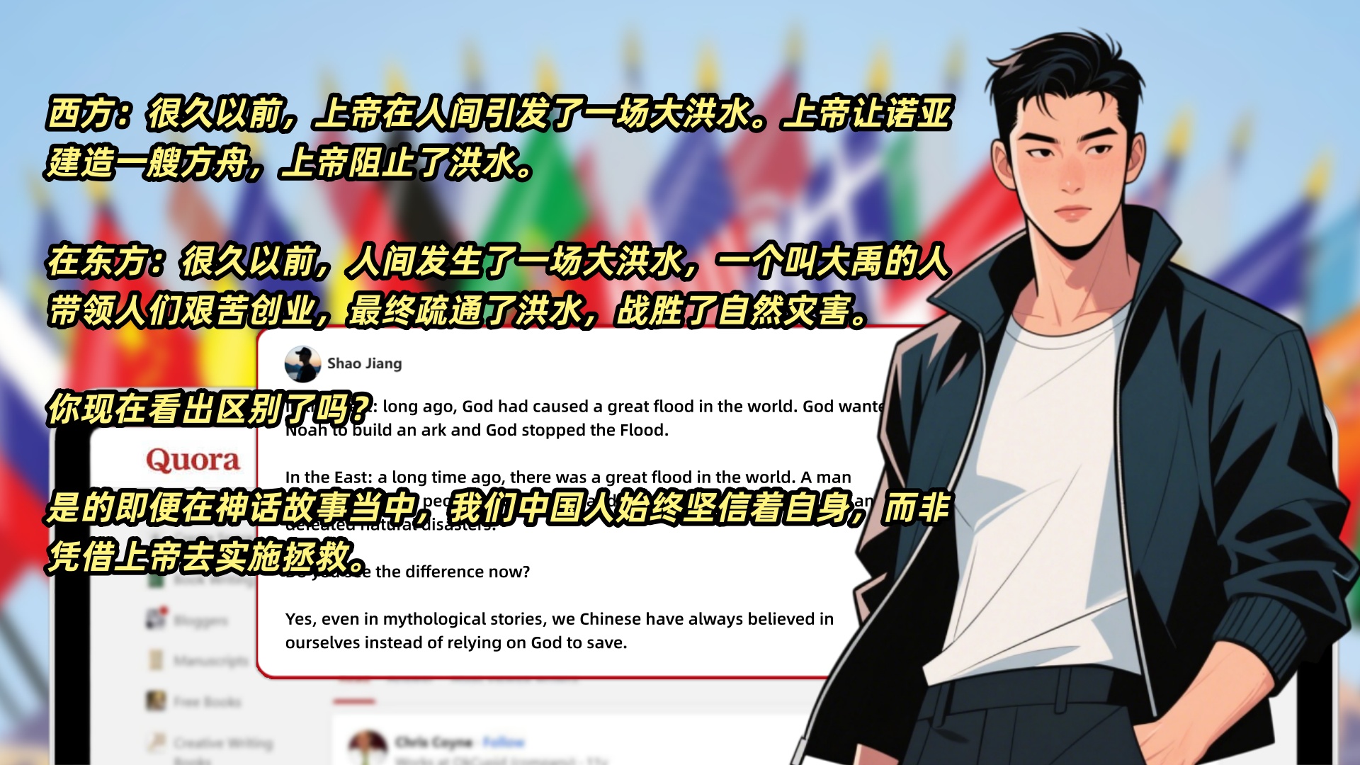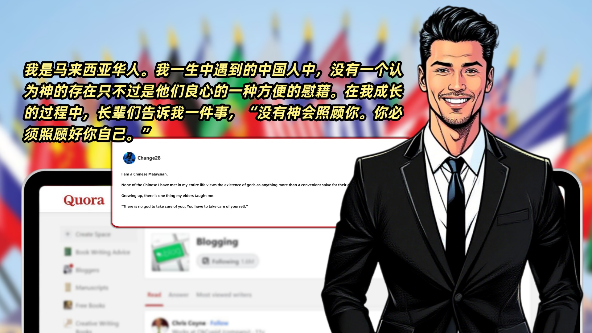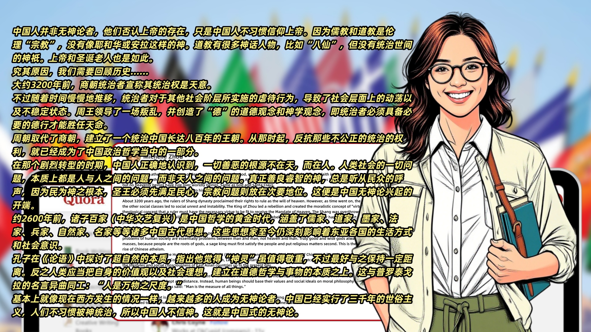 网友Michelle Zhou用历史分析道:中国人并非无神论者,他们否认上帝的存在,只是中国人不习惯信仰上帝。因为儒教和道教是伦理“宗教”,没有像耶和华或安拉这样的神。道教有很多神话人物,比如“八仙”,但没有统治世间的神祇。上帝和圣诞老人也是如此。