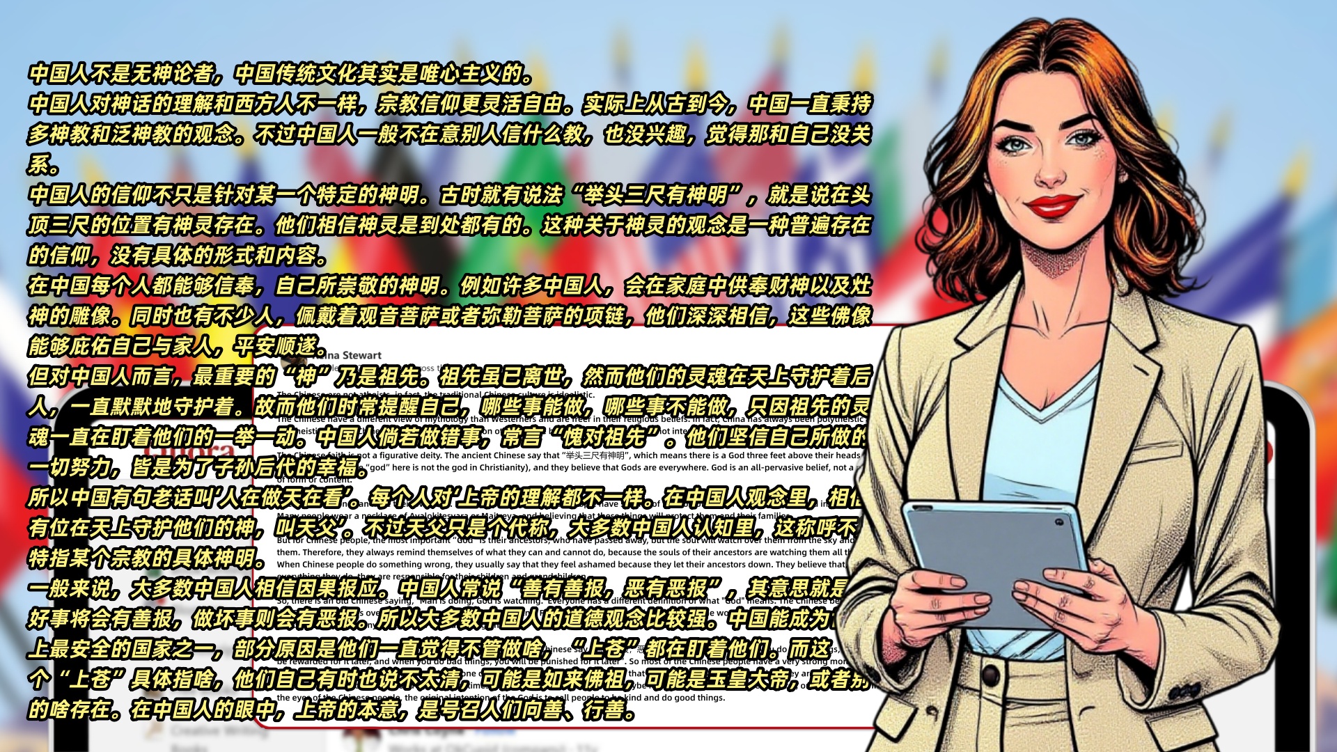 所以中国有句老话叫‘人在做天在看’。每个人对‘上帝的理解都不一样。在中国人观念里,相信有位在天上守护他们的神,叫天父’。不过天父只是个代称,大多数中国人认知里,这称呼不是特指某个宗教的具体神明。